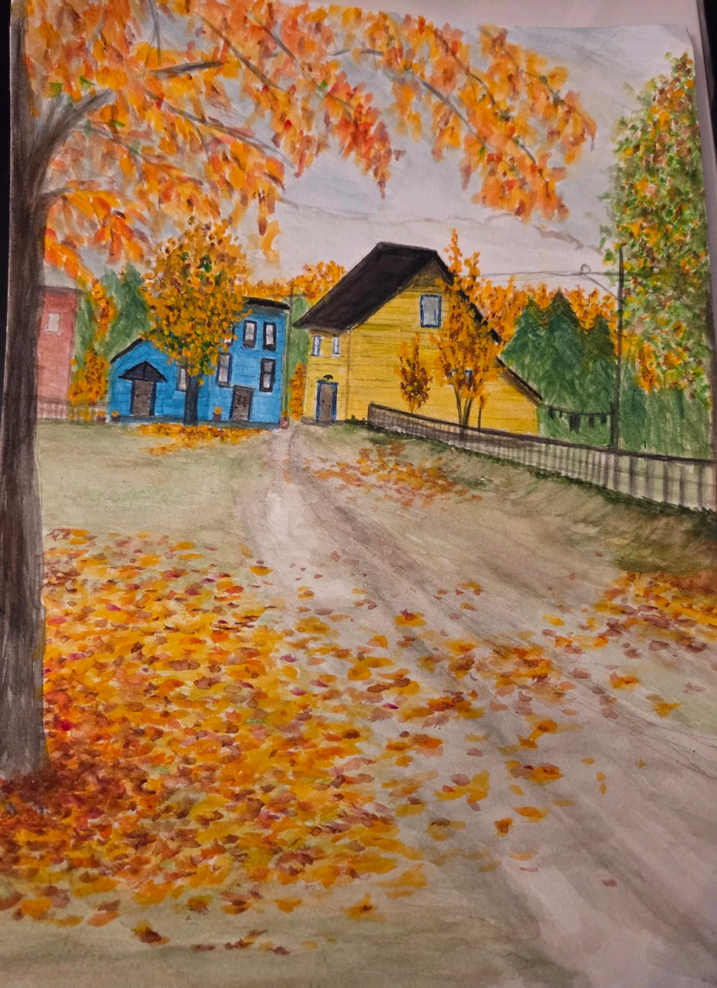 A beautiful watercolor painting capturing a picturesque autumn scene. It features a rustic dirt road leading to colourful houses, surrounded by trees with vibrant fall foliage. Fallen leaves scatter the ground, adding to the cozy atmosphere of the season. This artwork would bring a touch of nature's beauty to any space.11 by 14 inches, original art