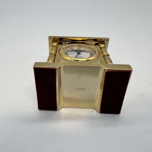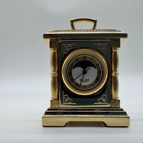 This is a beautiful vintage Bulova mini carriage clock, dated 1988 and made in Japan. It features a classic gold-tone carriage design with green decorative panels, Roman numeral dial, and a moonphase-style upper display. Compact, elegant, and perfect for collectors or desk décor.