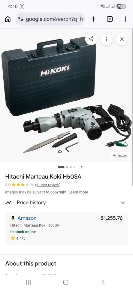 Selling a Hitachi H 655C Portable electric jackhammer with carrying case. Comes with flat and pointed bits. Works like new.