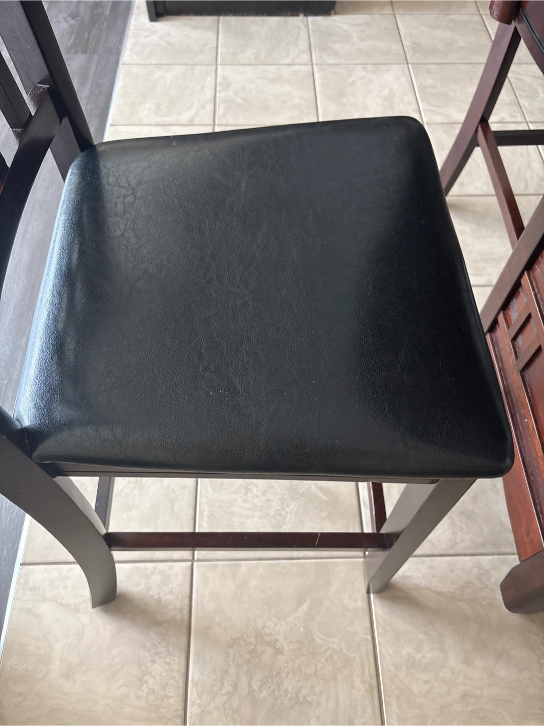 This dining set includes a round, dark wood table and four chairs with black faux leather seats. The table has a convenient shelf underneath. Chairs are comfortable for seating.