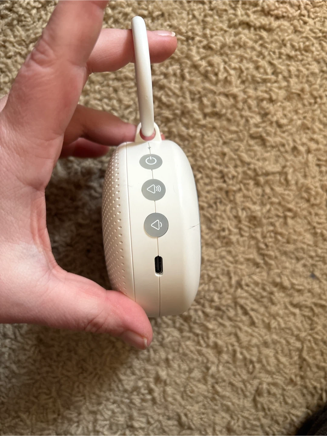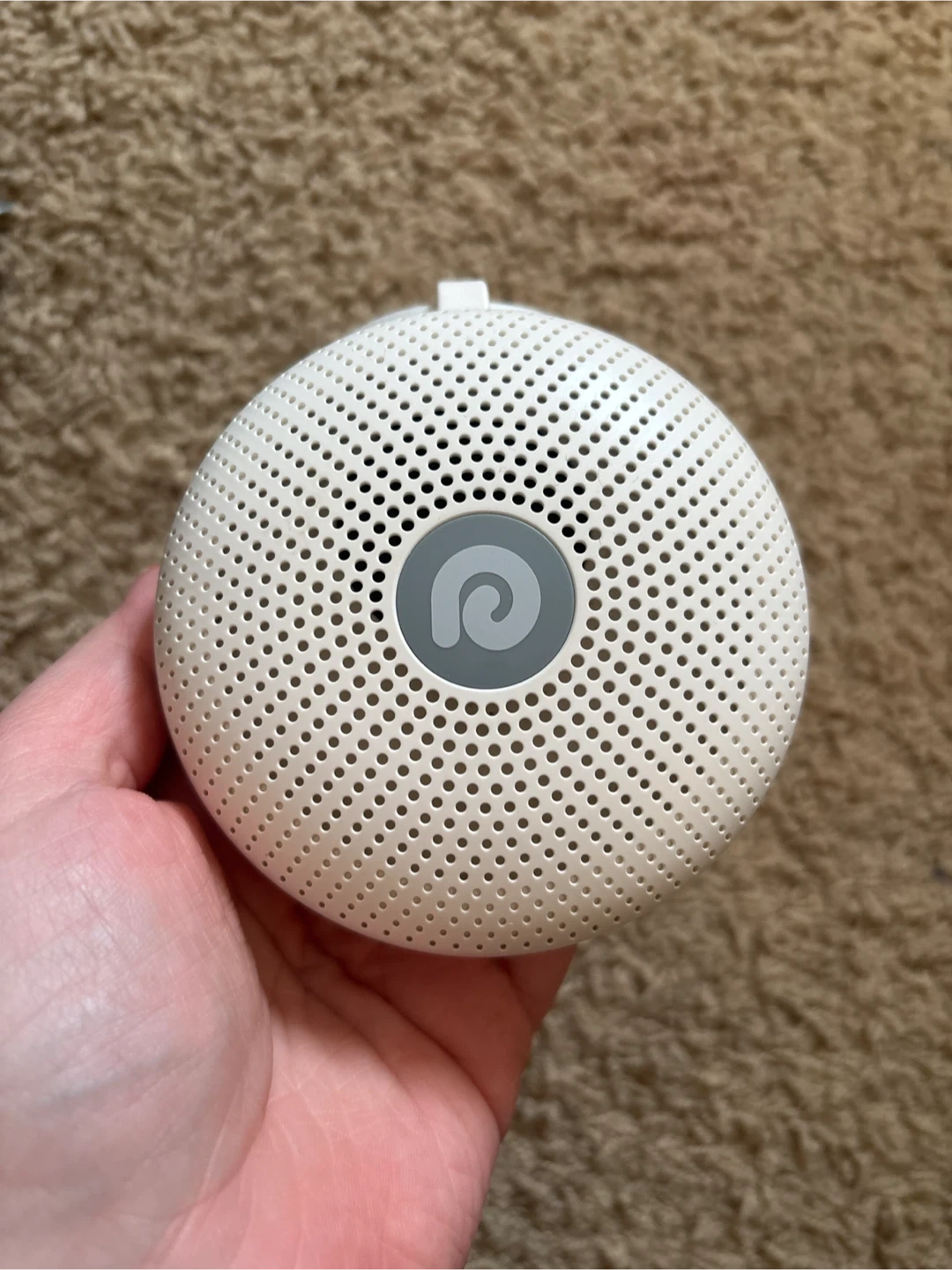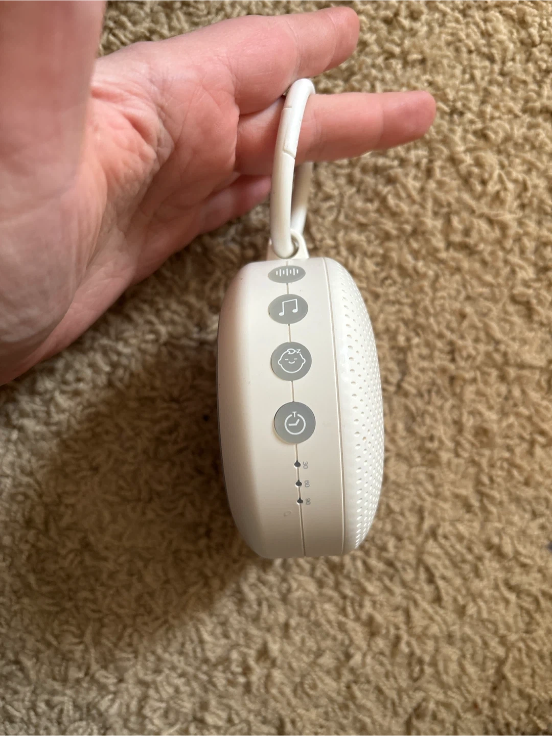 Portable white noise sound machine with multiple sound options and timer settings. It's rechargeable and has a hanging loop for easy placement. Offers 15 soothing sounds including lullabies and nature sounds. Great for babies and adults needing sleep or focus!