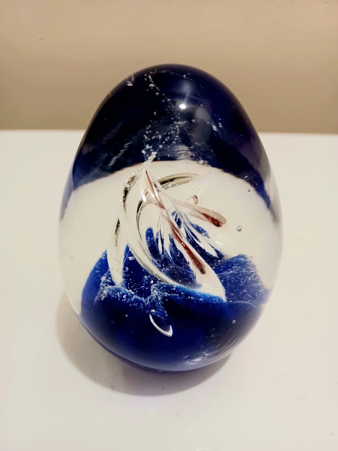 Add a touch of elegance to your desk with this beautiful, Hand Blown glass paperweight featuring a Controlled Bubbles striking Cobalt Blue and clear design with a delicate white Swirl encased within.