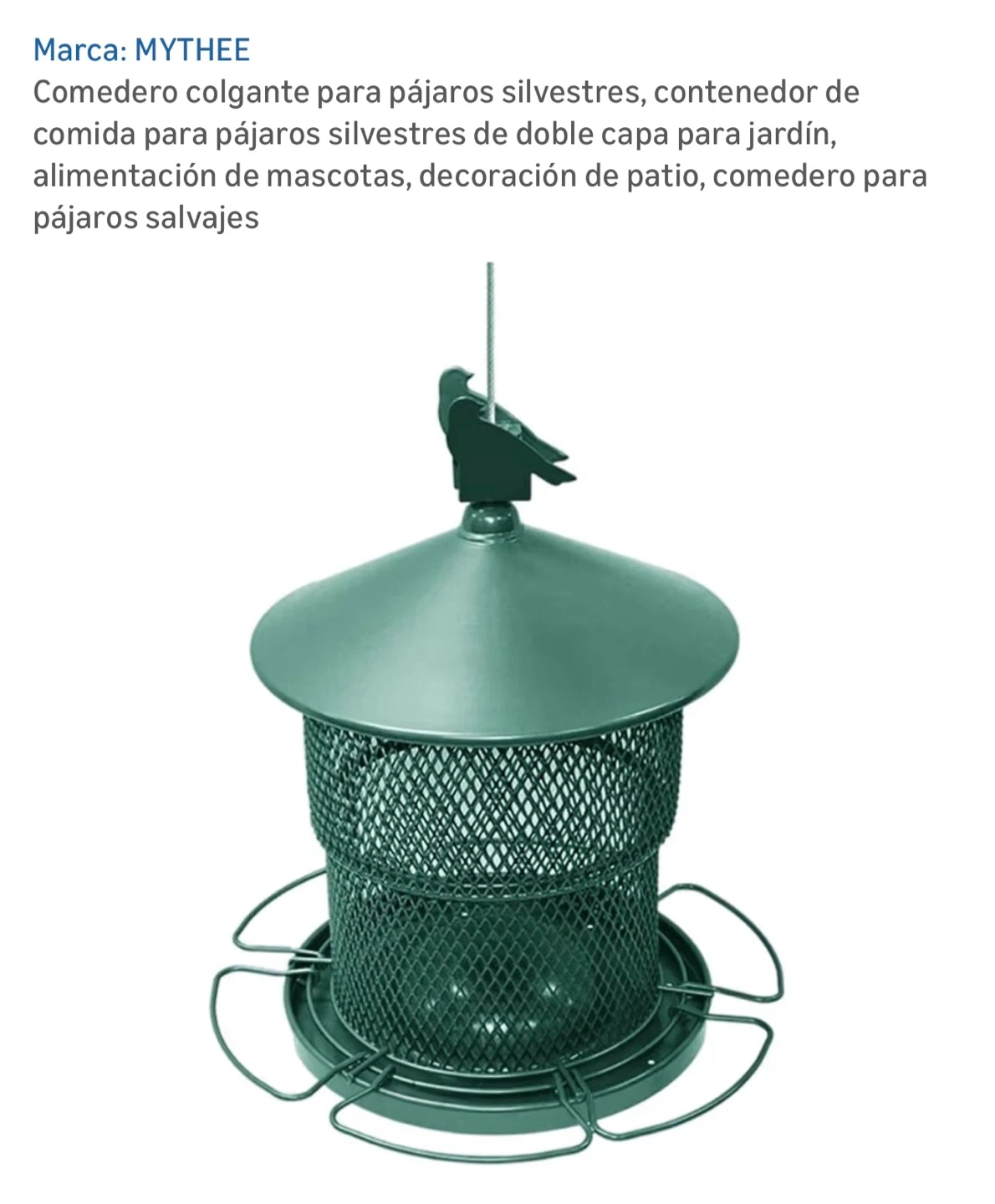 This is a set of two hanging bird feeders by MYTHEE. They're made of green metal with a mesh design to hold birdseed. The feeders include a tray at the bottom and a lid at the top.