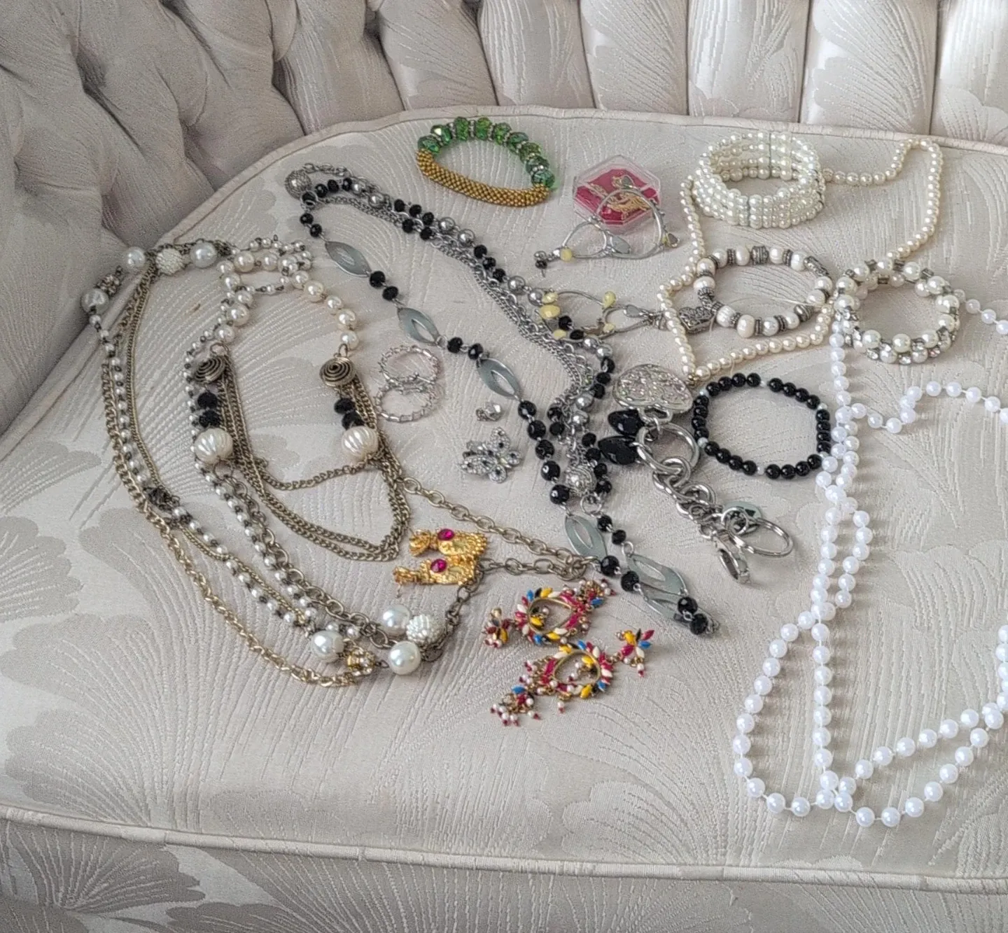 This lot includes a variety of costume necklaces and bracelets. Features pearls, beads, and decorative charms. Great for accessorizing any outfit!