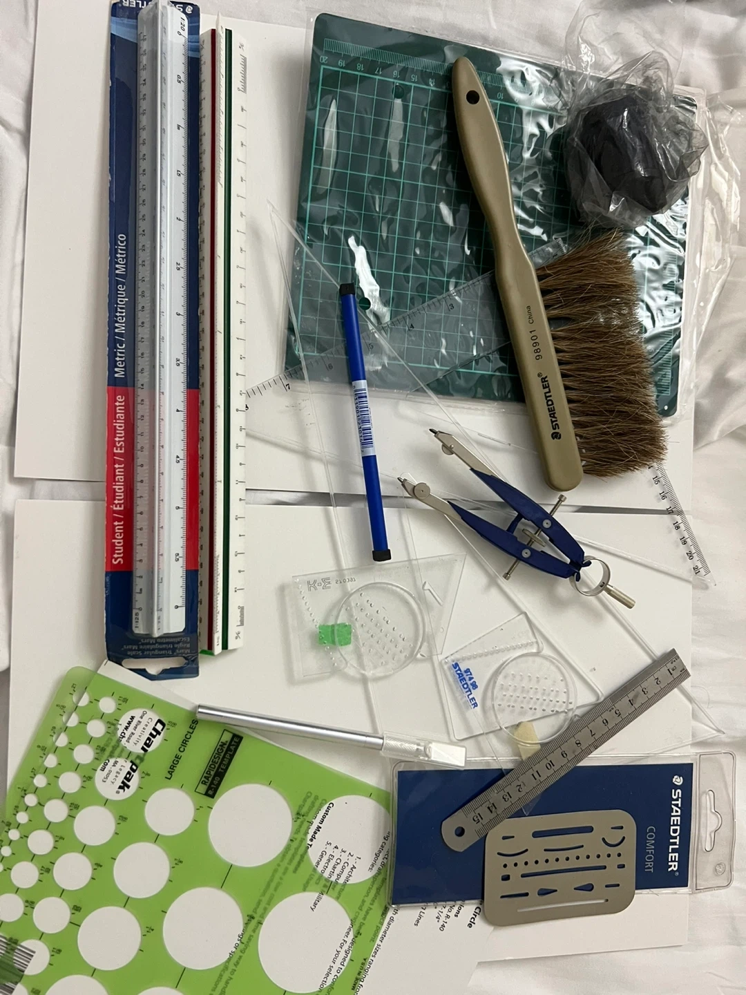 Selling a comprehensive set of drafting tools, perfect for students or professionals! Includes items from Staedtler, Chartpak, and Rapidesign. You'll find everything you need for technical drawing and design projects in this collection