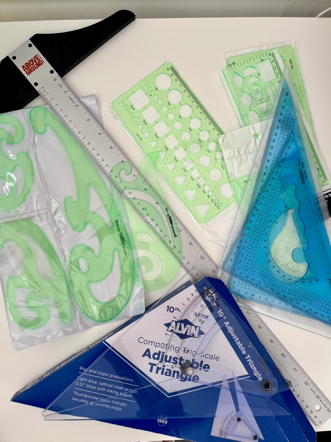 * Drafting tools such as a shape ruler * Geometric accessories and shapes for layouts and detailing * Except for T-square ruler, which is sold. Most items are lightly used and in good condition. Perfect for students, architects, or hobbyists working on scale models. All in $20 * Only cash and Pick up * No Return. Check out my other listings😊