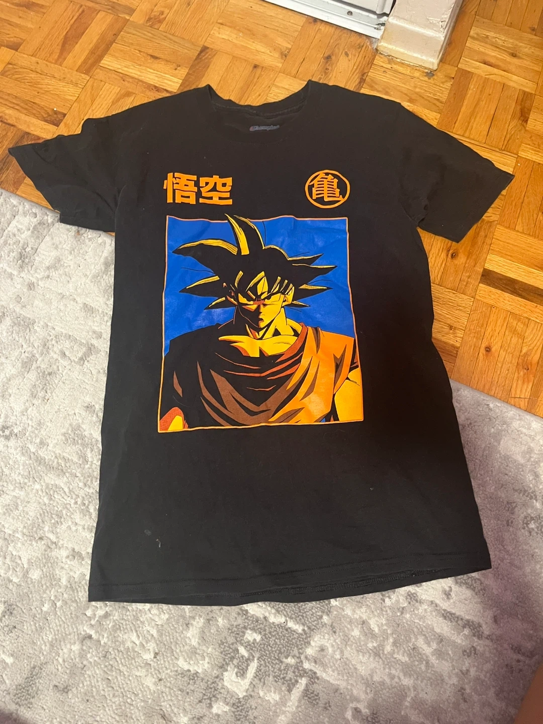 Selling a black Dragon Ball Z t-shirt featuring Goku. It has a cool graphic print on the front. There are some signs of wear, as seen in the photos.