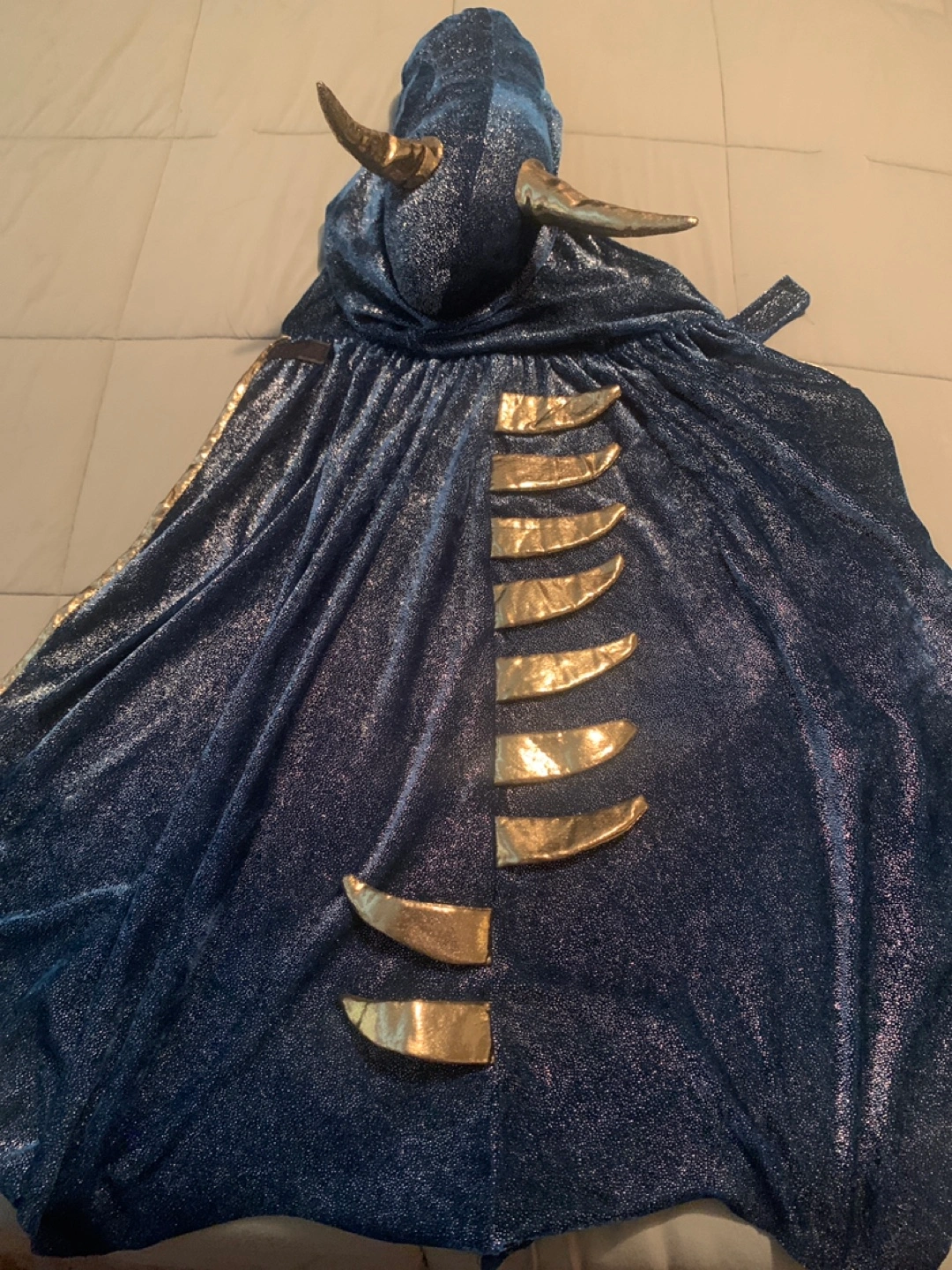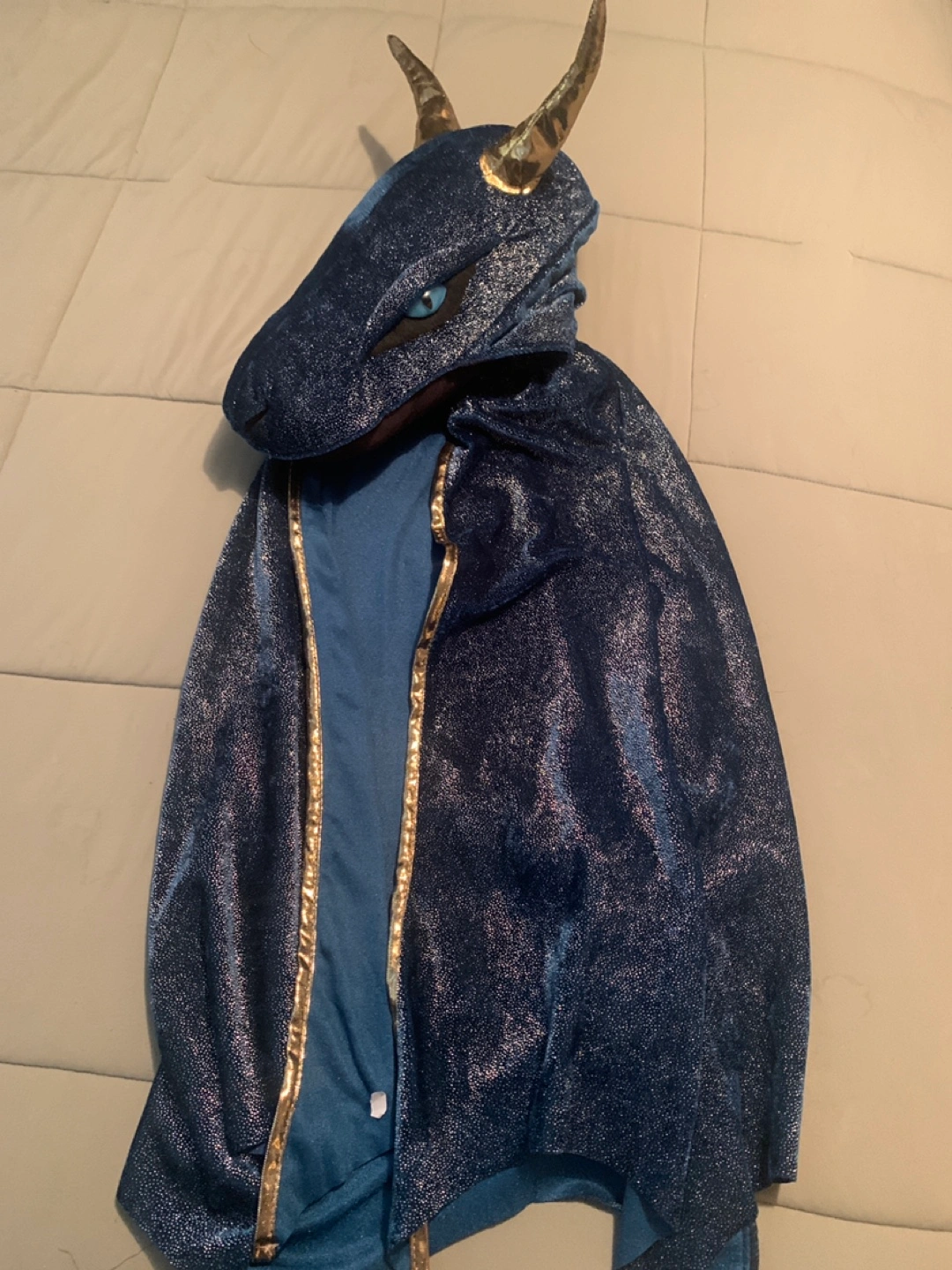 A fun dragon costume perfect for dress-up or Halloween! It features a blue and gold design with horns and scales. Great condition and ready for a new adventure