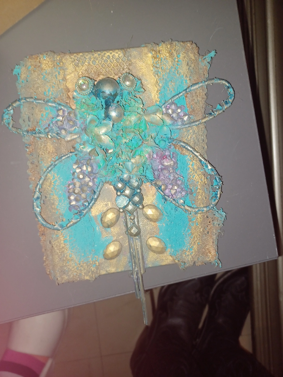 Unique dragonfly wall art piece with a textured background and embellished details. The dragonfly itself features intricate wirework and decorative stones. Perfect for adding a touch of whimsy to any room