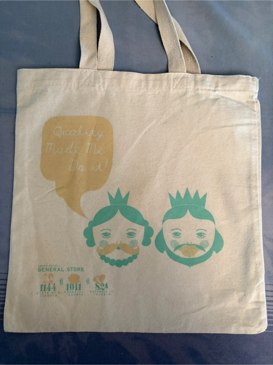 Cute tote bag from the Drake Hotel General Store! It features a unique design with two characters and the phrase "Quality Made Me Do It”. The size of a vinyl record.