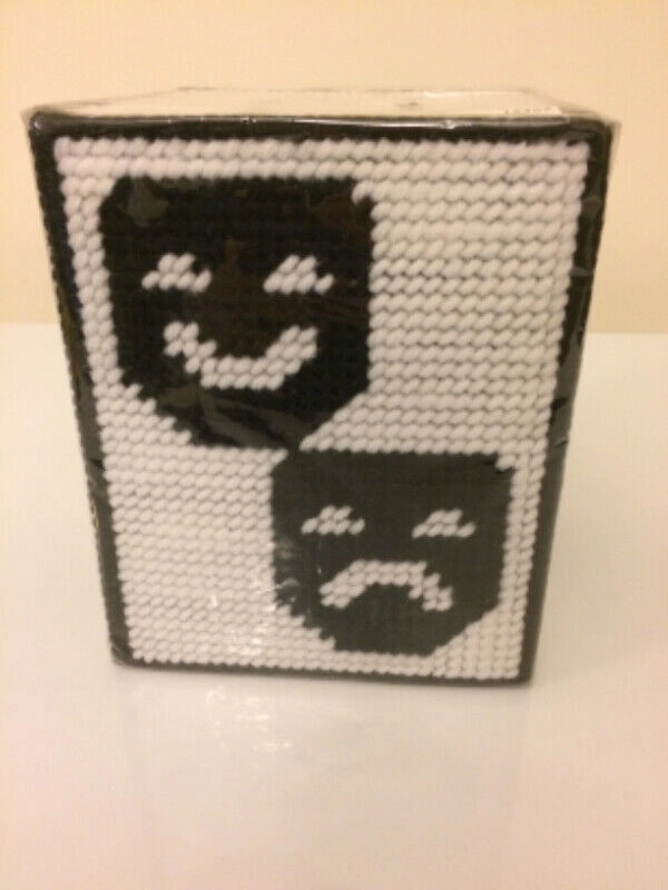Drama tissue box cover for sale. New. Features comedy and tragedy masks in black and white. Makes great home decor or gift for the aspiring actor in your life. $15. Near the Burlington/Oakville border. No delivery.
