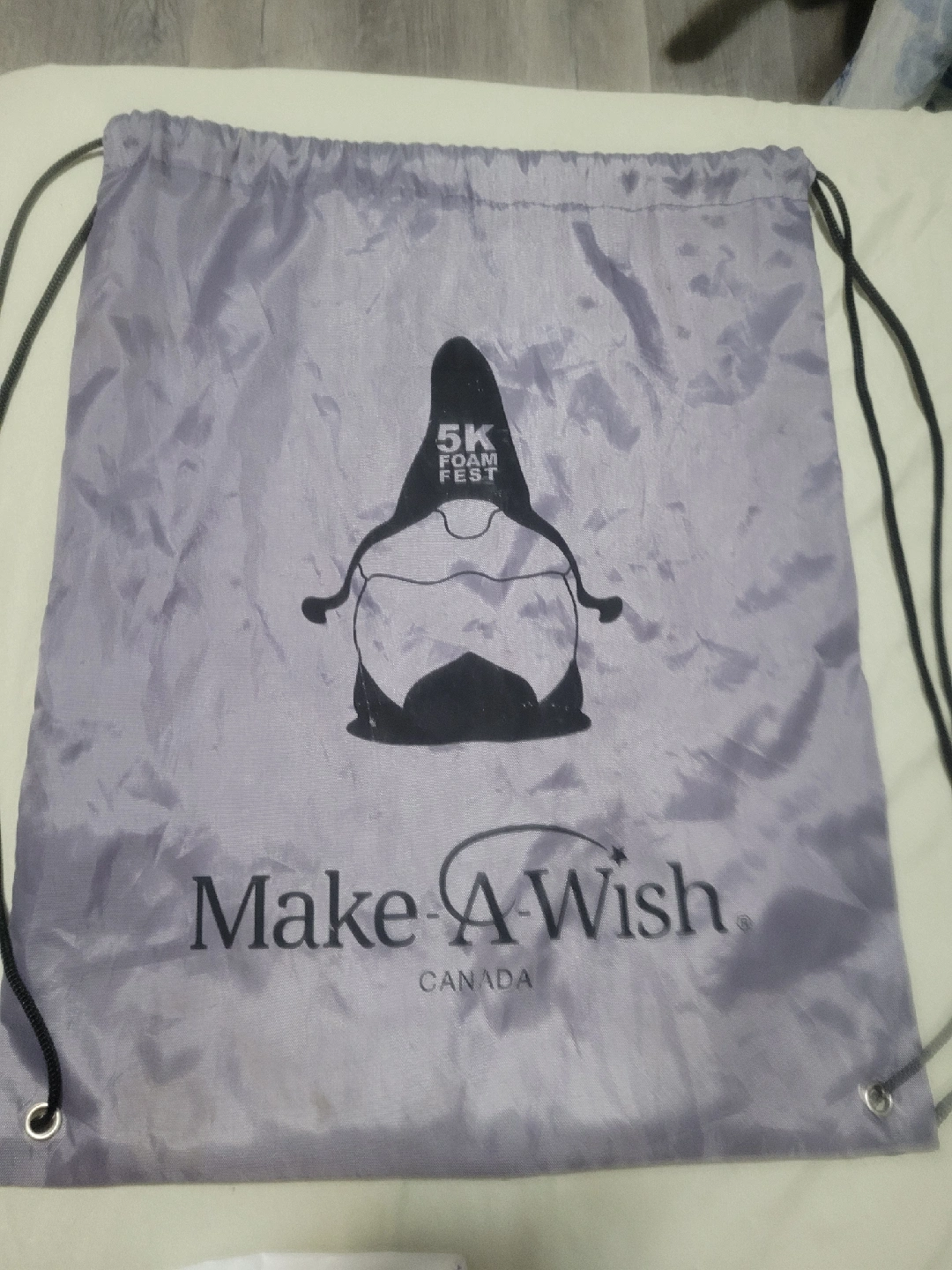 Drawstring bag from the Make-A-Wish 5K Foam Fest! Great for carrying your essentials to the gym or for everyday use. Lightweight and easy to carry around!