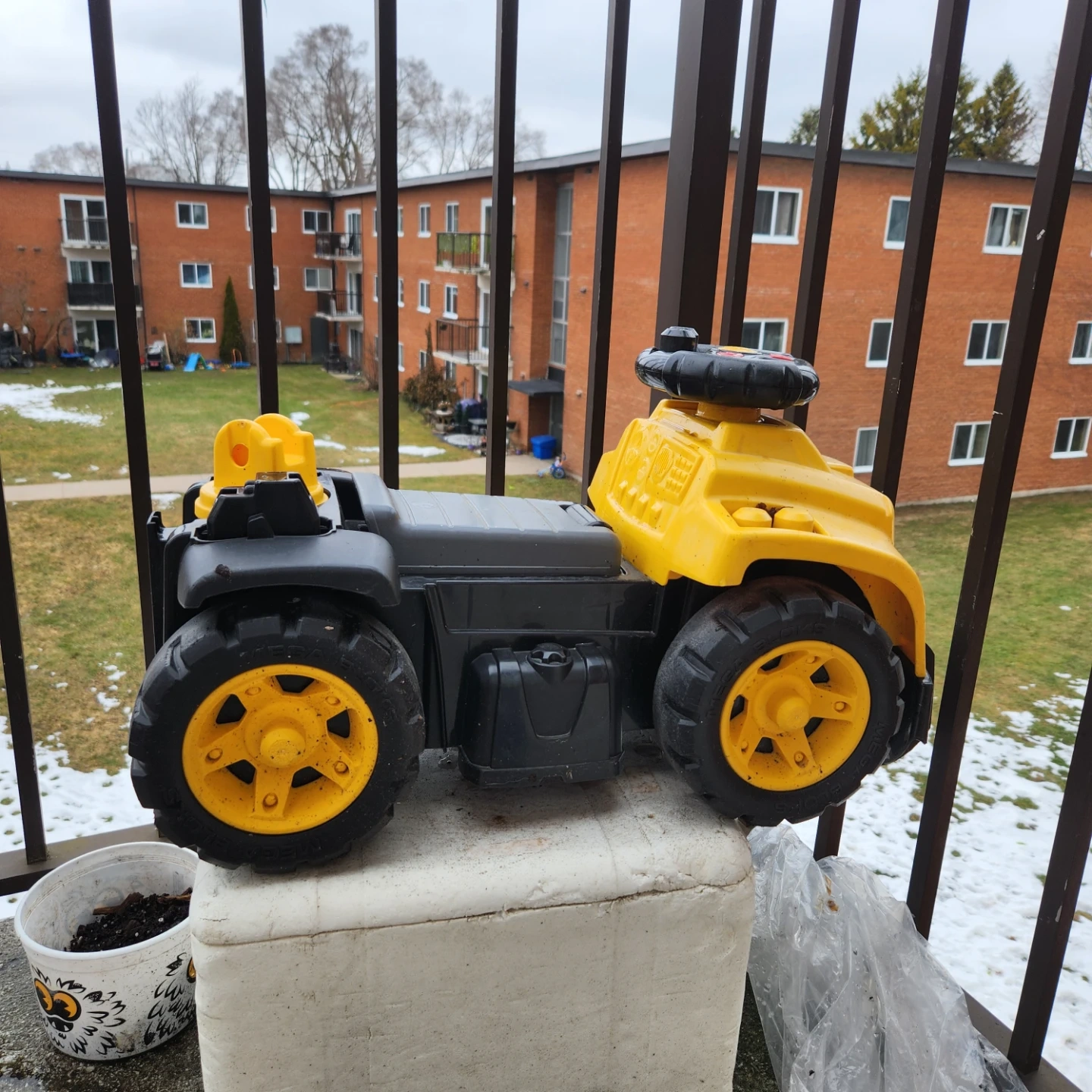 A yellow and black MEGA BLOKS ATV toy. Wheel diameter is approximately 22 x11 inches. This toy is great for outdoor play!