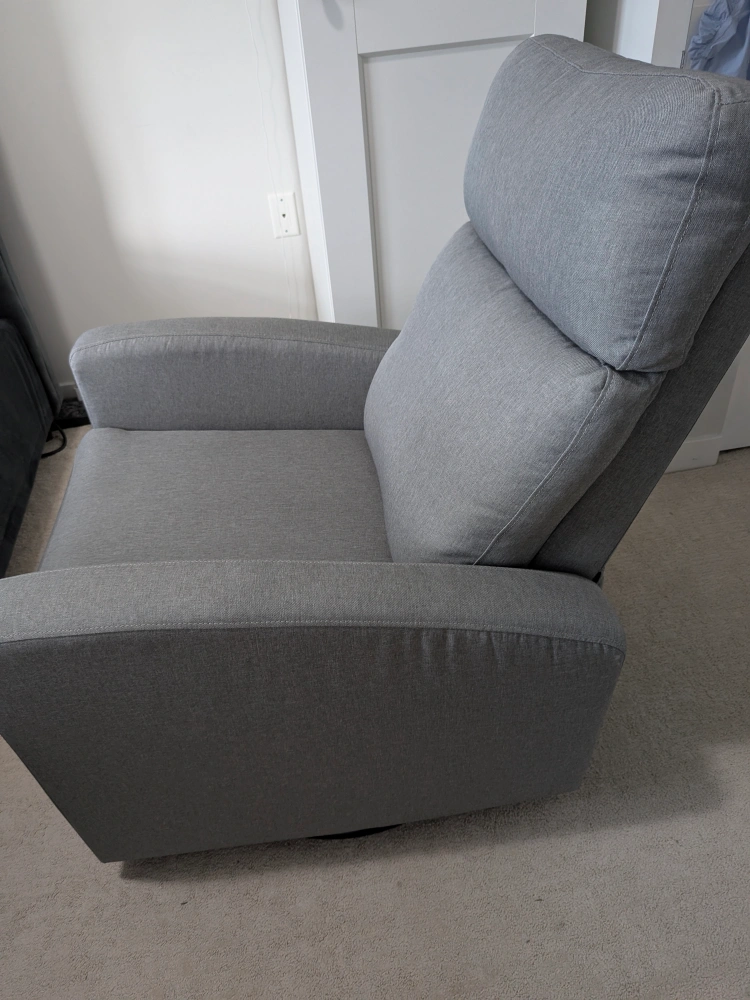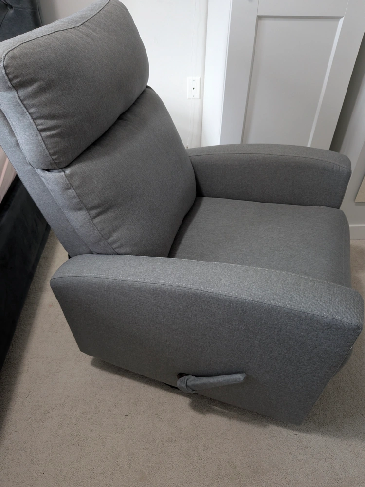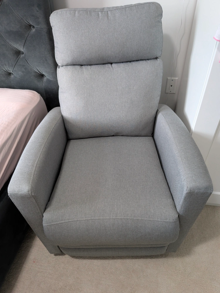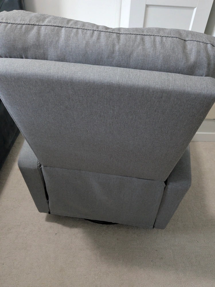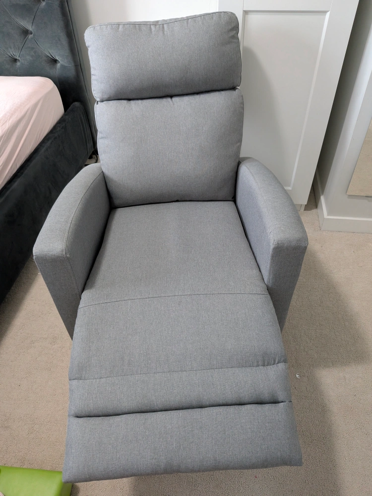 246Approx 26"(Length)x35"x40"(Height) Selling a comfy grey recliner chair! It's in great shape and ready for a new home. Perfect for relaxing after a long day, this chair offers excellent support and a smooth reclining motion. It would be a great addition to any living room or bedroom
