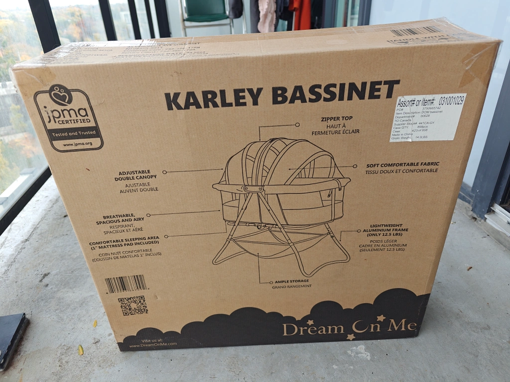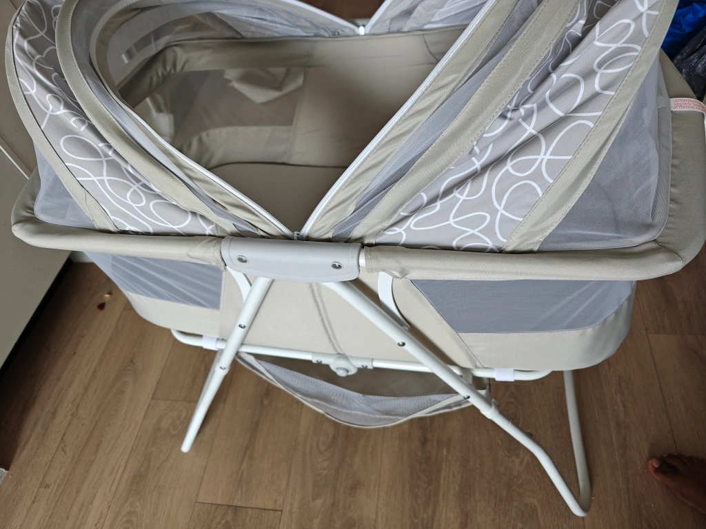 529Grey bassinet with white mesh canopy, mesh can be zipped from both the sides and includes a storage basket underneath. Folds for easy storage and carrying. with the original box, manual and wrappers came with it. Like new, have not really used it. Disassembled and packed for easy carrying in the original box.