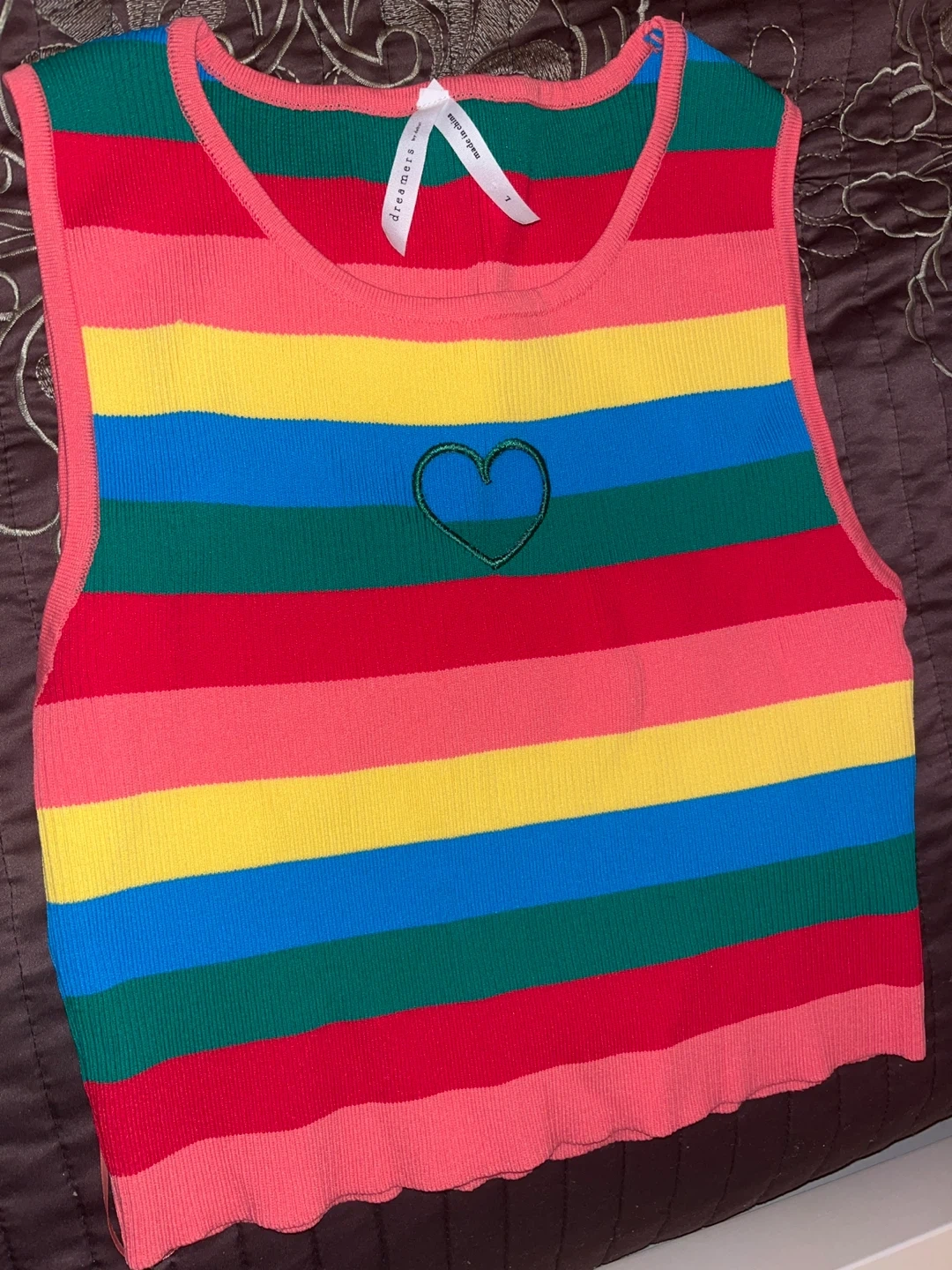 10This is a cute and colourful tank top from Dreamers! It features a rainbow striped pattern with a heart detail. Size large.