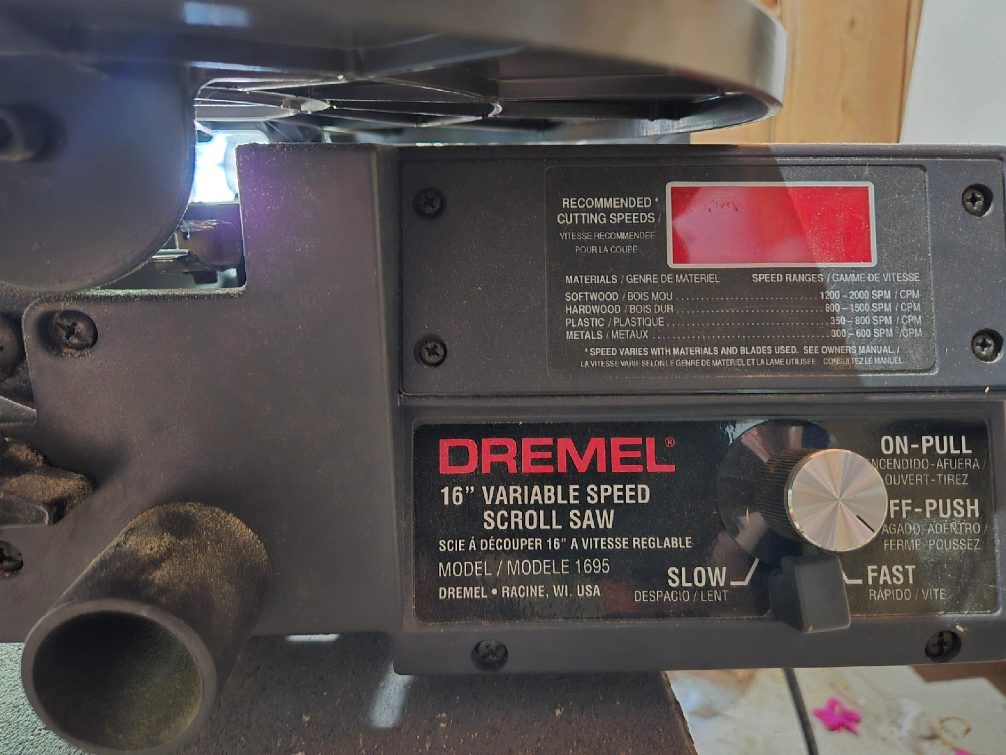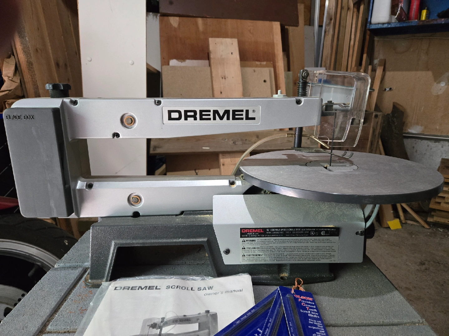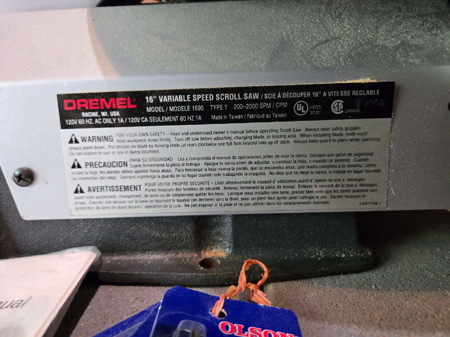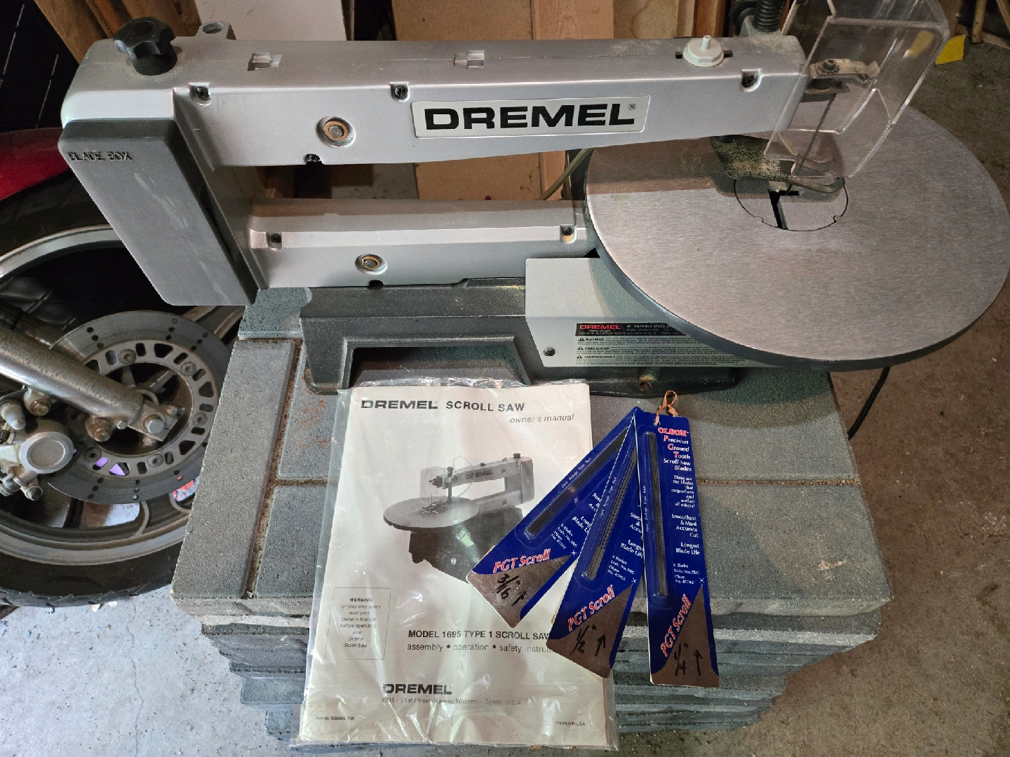 10Like new (used twice?) Dremel model 1695 variable speed scroll saw. Includes 3 brand new pkgs of 6 blades - 3/16, 1/4 & 1/2"; cover and OWNERS MANUAL.