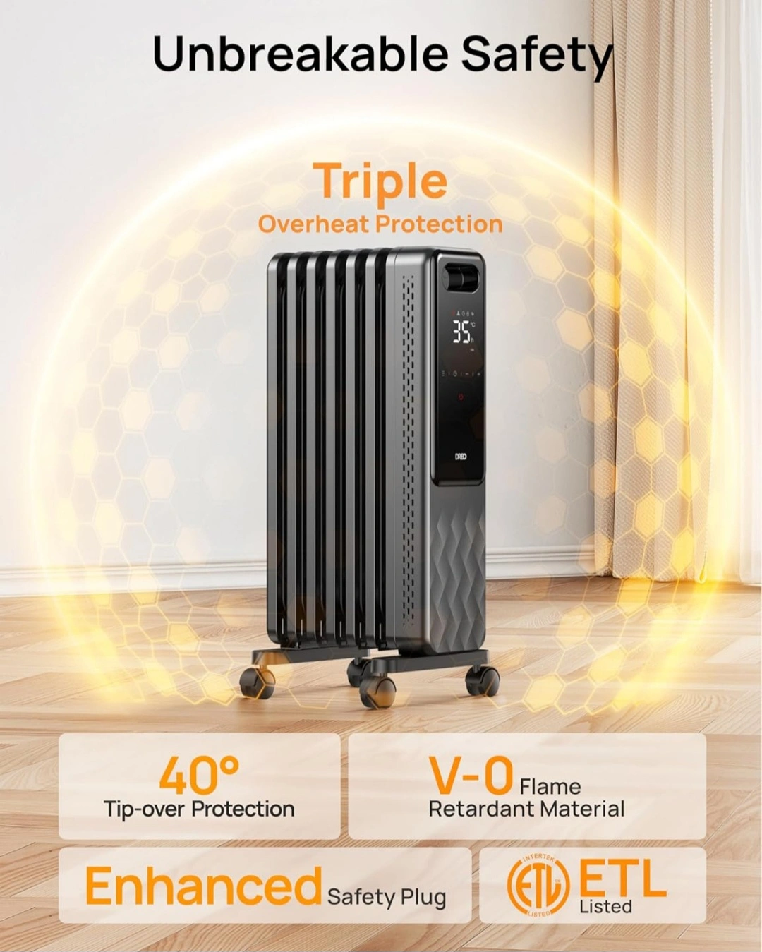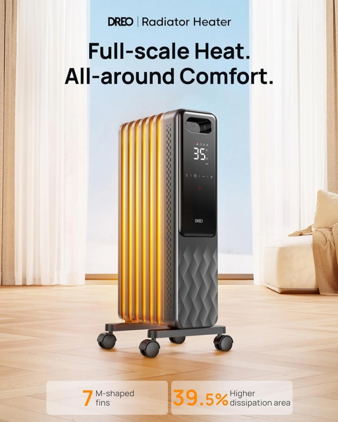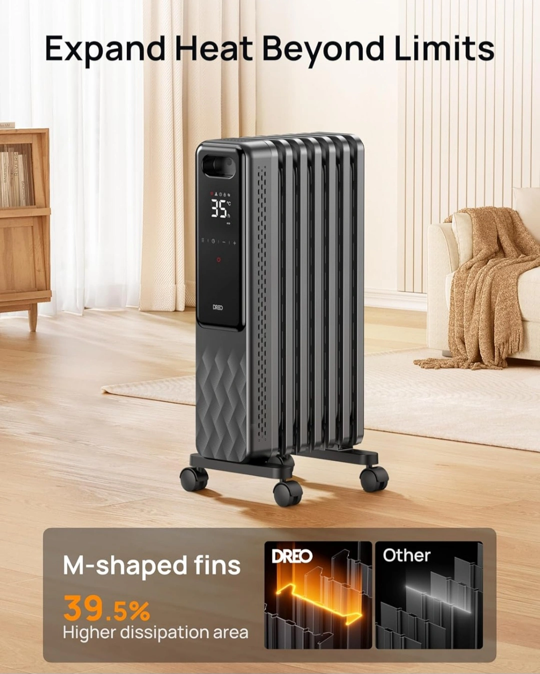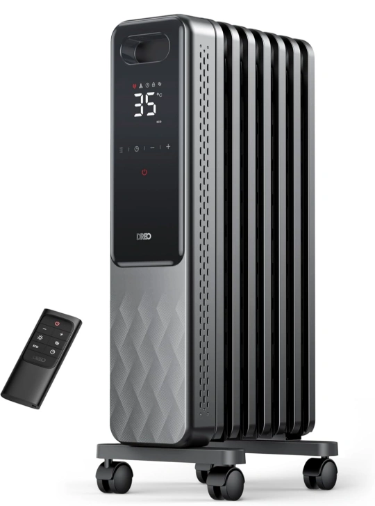 319Electric radiator heater. Features seven M-shaped fins for efficient heat dissipation. Includes a digital display and remote control. Equipped with overheat protection and tip-over safety features. Easy mobility with integrated wheels.