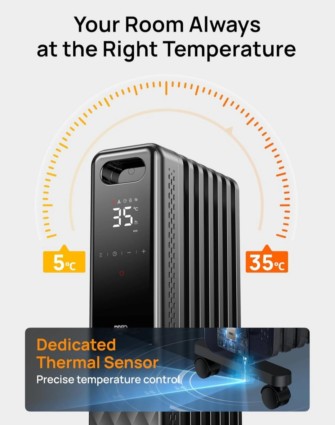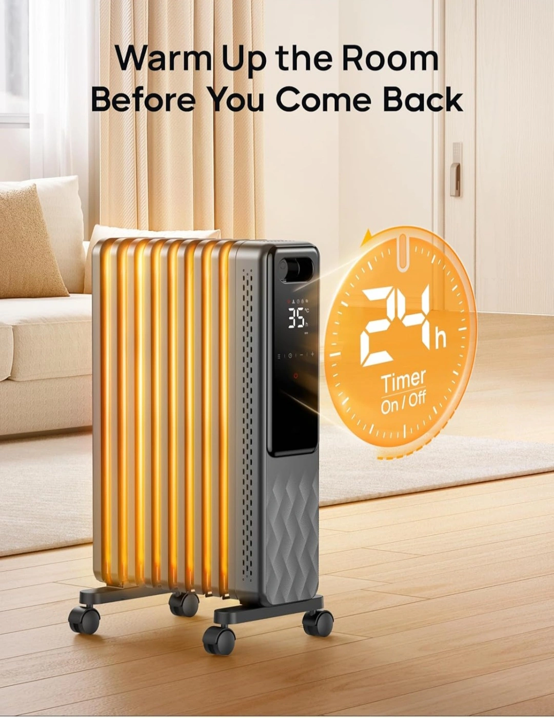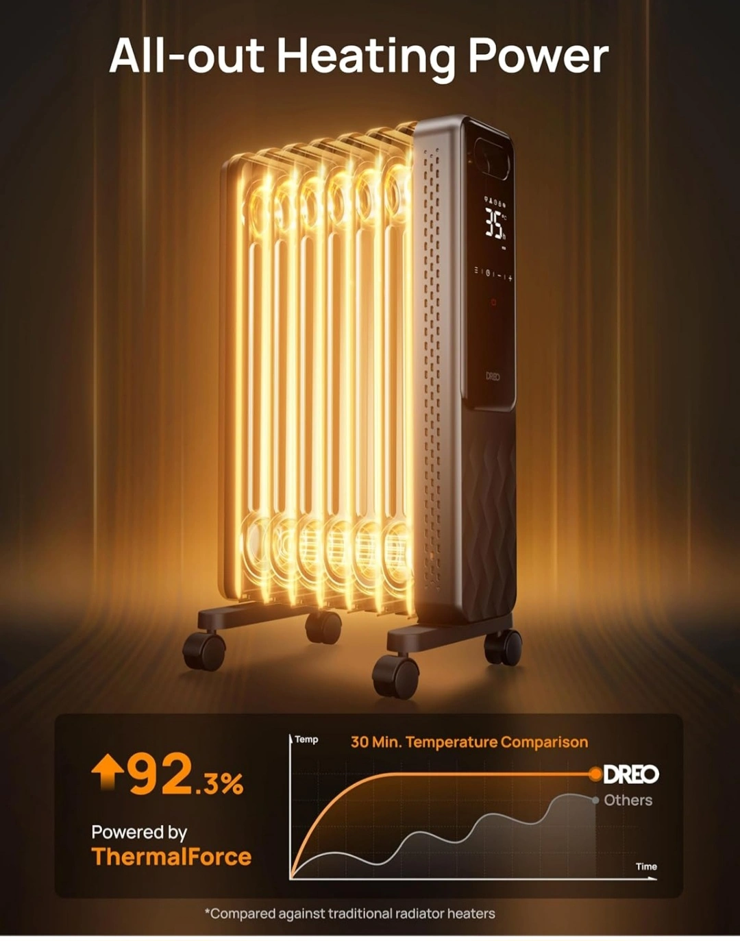 319Electric radiator heater. Features seven M-shaped fins for efficient heat dissipation. Includes a digital display and remote control. Equipped with overheat protection and tip-over safety features. Easy mobility with integrated wheels.