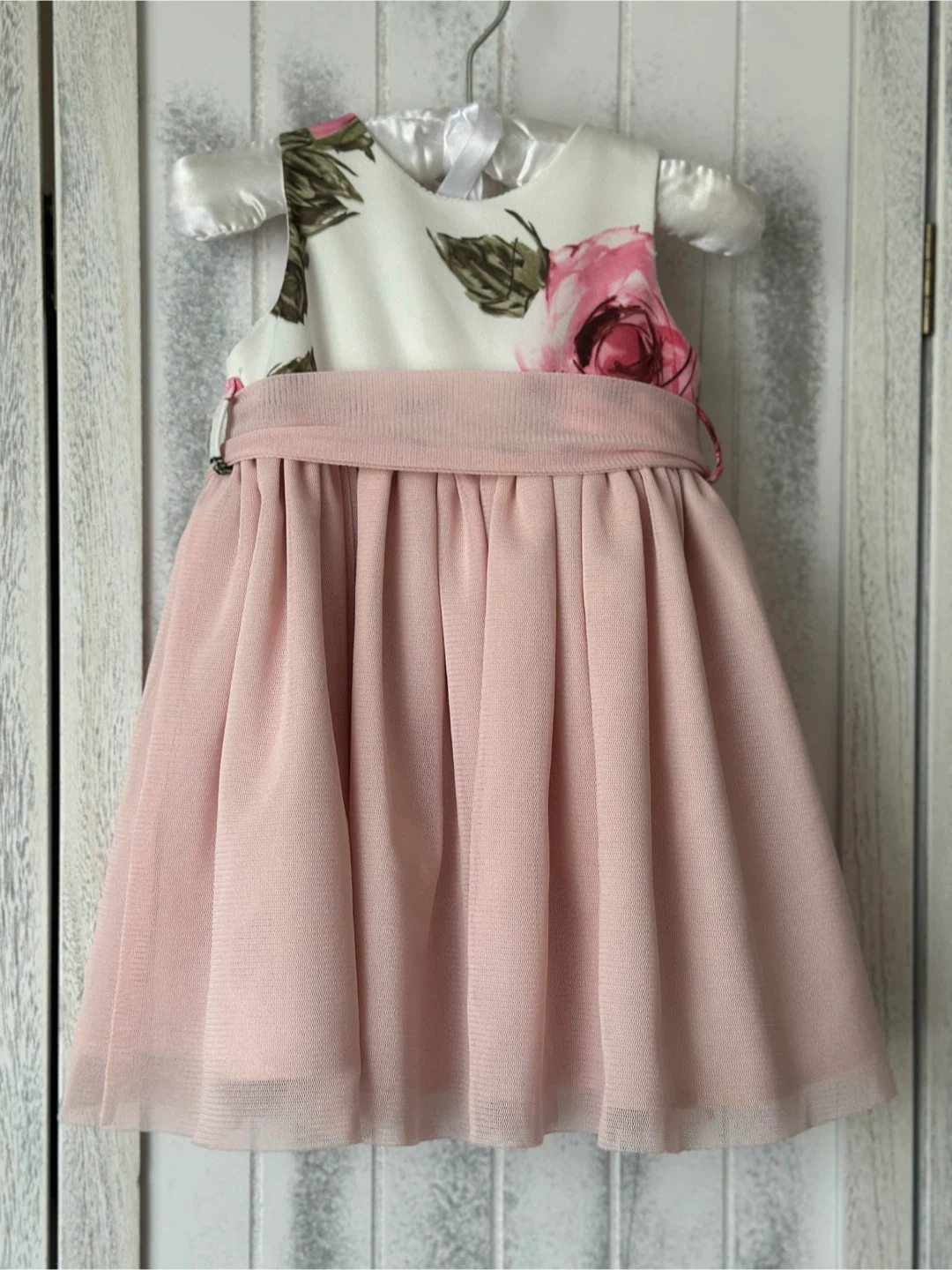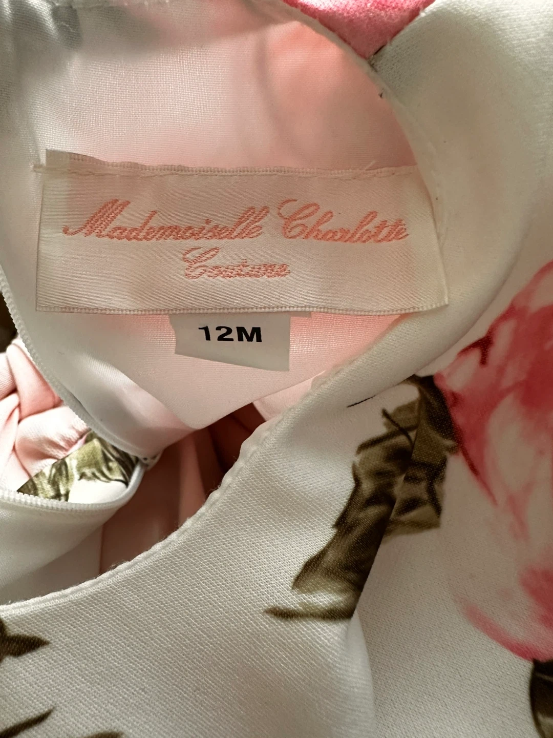 65A beautiful Mademoiselle Charlotte Couture dress in size 12M! It features a lovely floral print on the bodice and a soft, flowing pink skirt. Perfect for a special occasion or just looking extra cute.