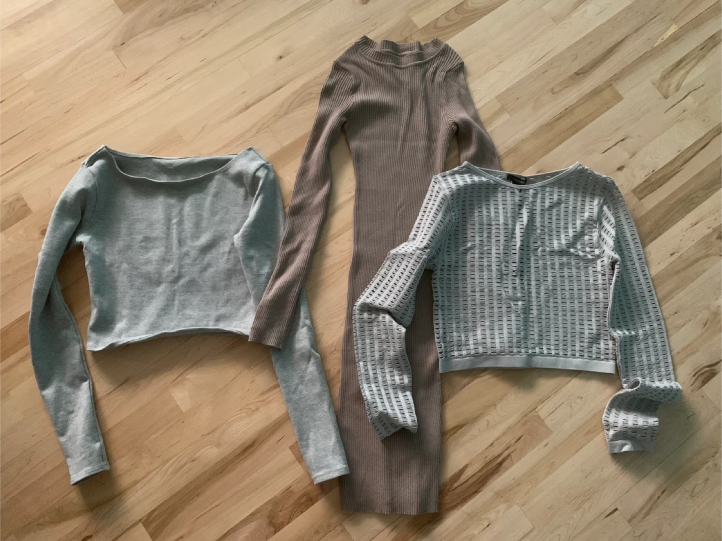 16Selling a cute dress and top set! The dress is a ribbed knit, bodycon style in a neutral brown colour. The top is a long-sleeved, open-knit style in a light grey colour. Both are new.