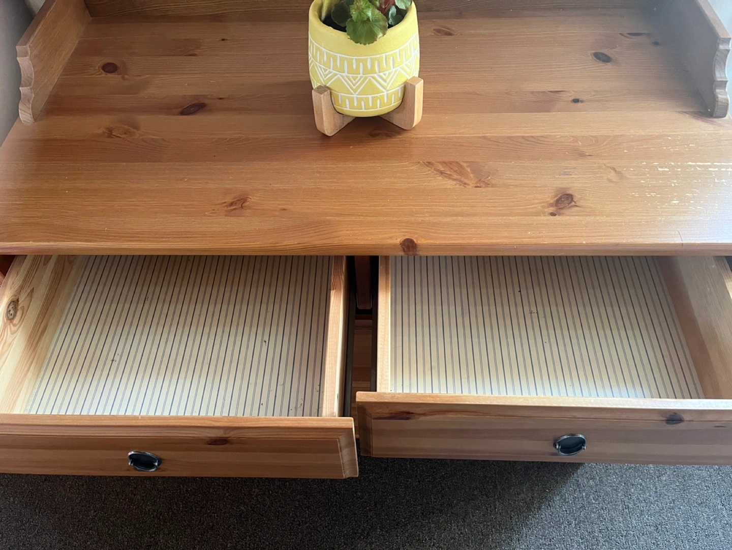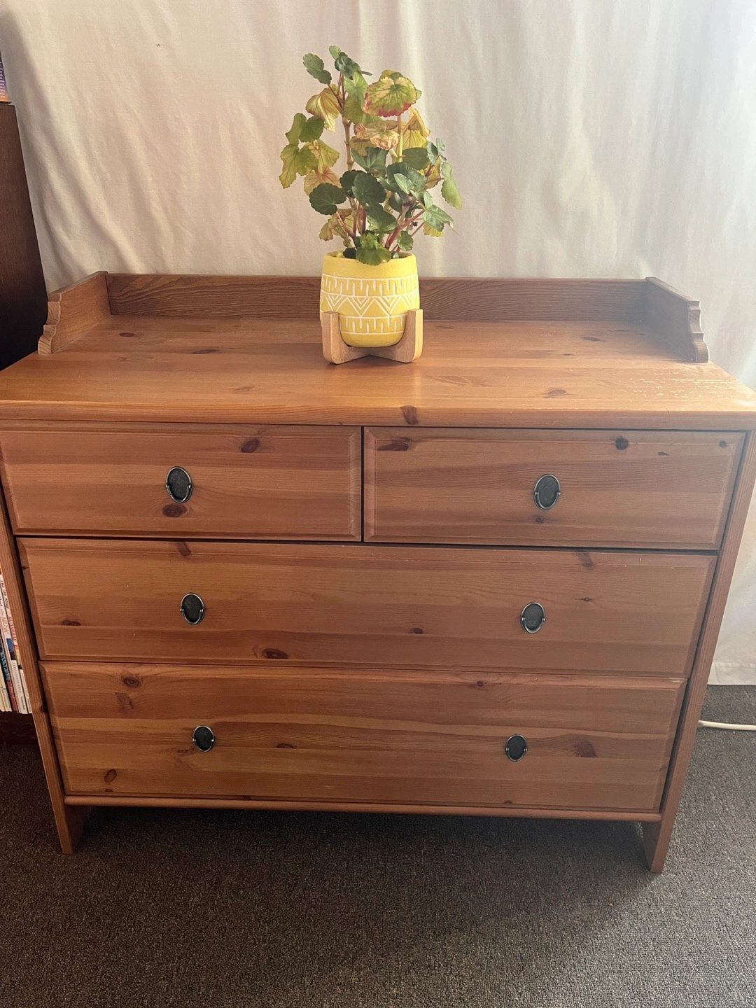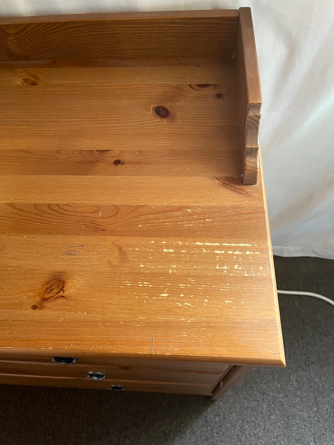 43Perfect for those who like to fix/ make furniture their own. Still usable in good/okay condition; top has some scratches (can be fixed with some refinishing). Second drawer gets stuck (comes of tracks) but closes. New IKEA dressers this size sell for $399 and up.