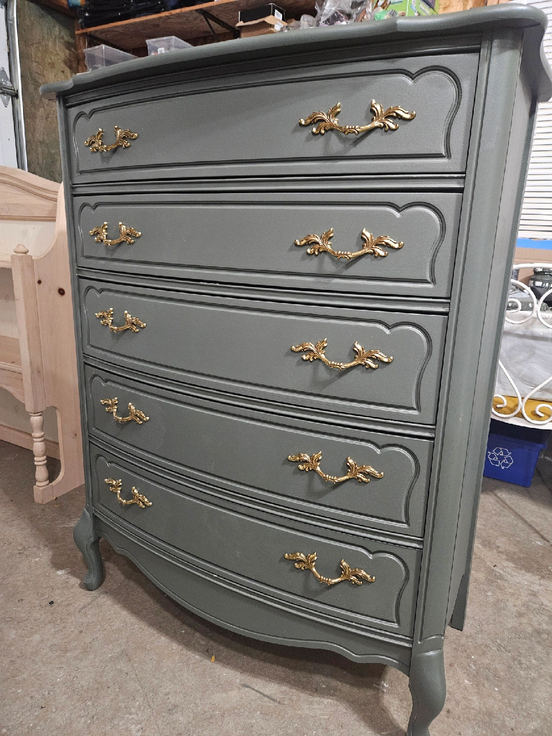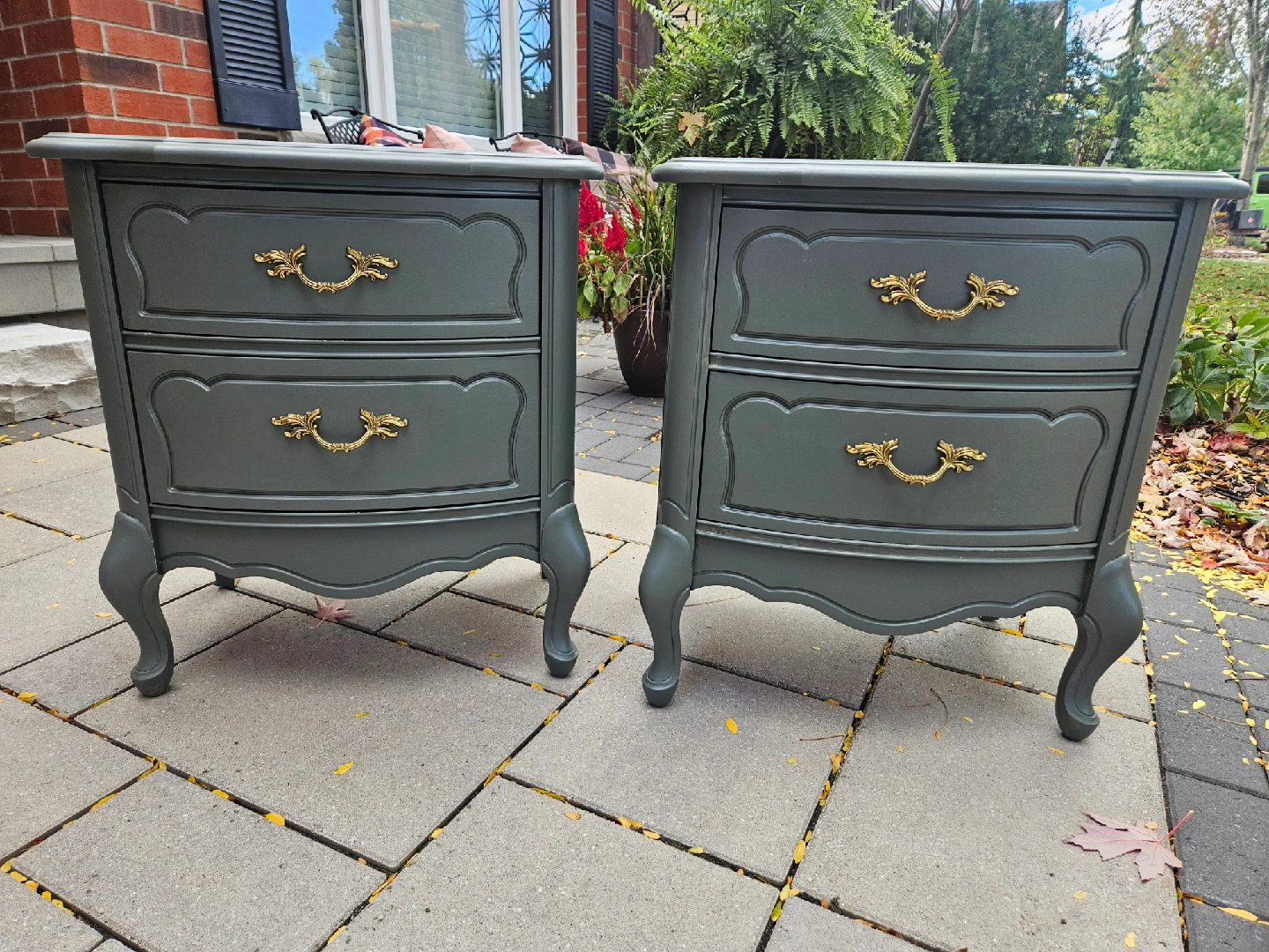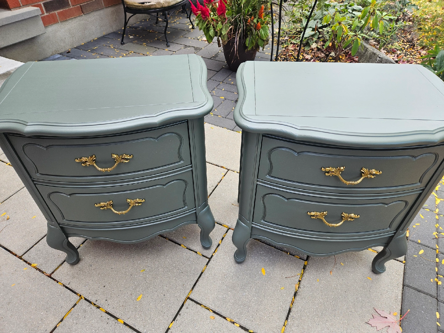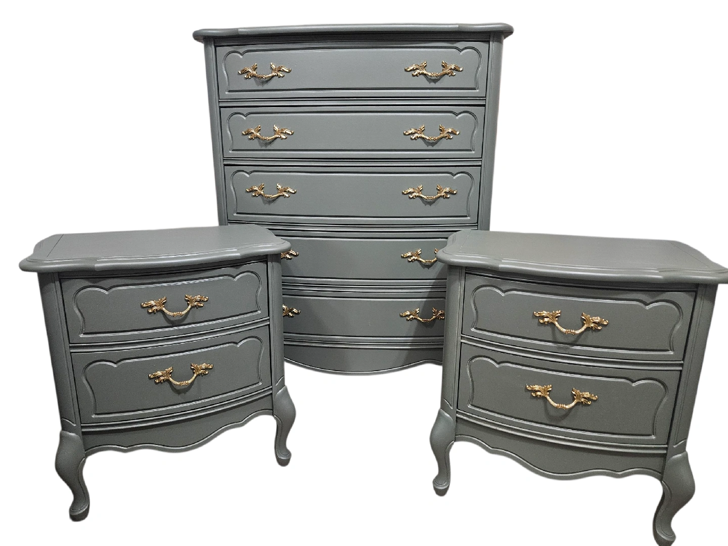 Selling a lovely dresser and two matching nightstands. They feature a stylish grey/green paint finish and ornate gold-tone handles. Perfect for adding a touch of elegance to your bedroom!