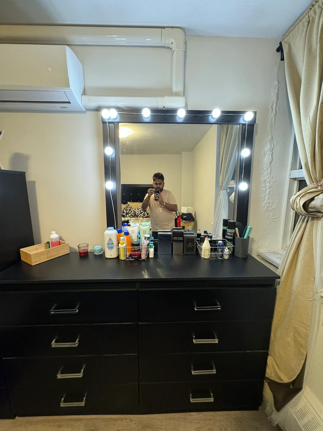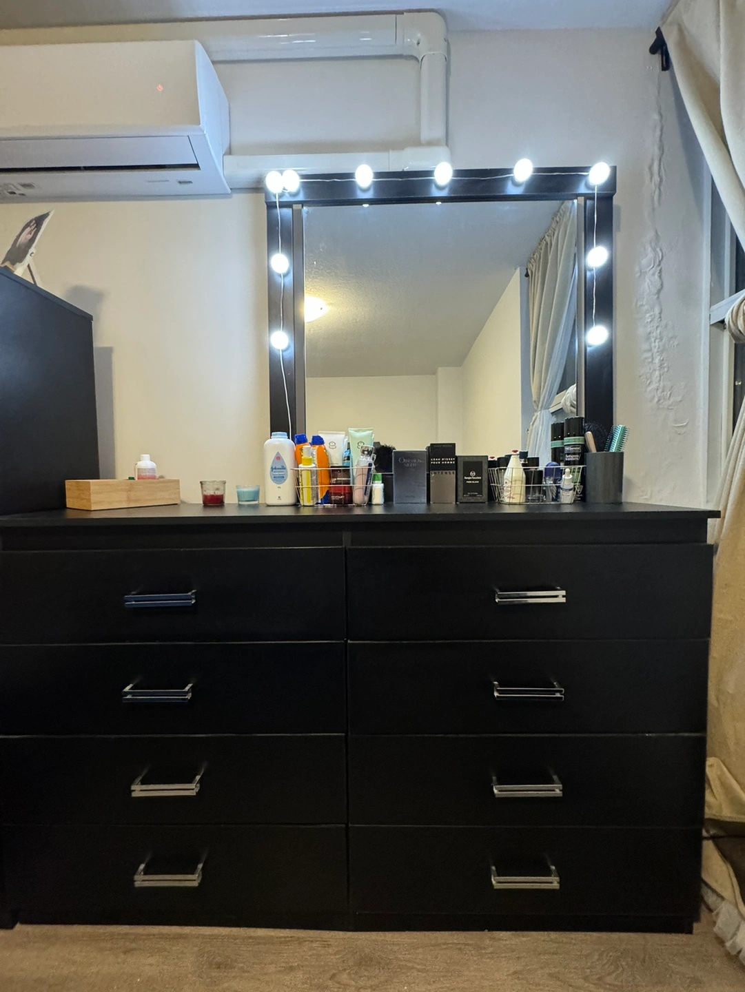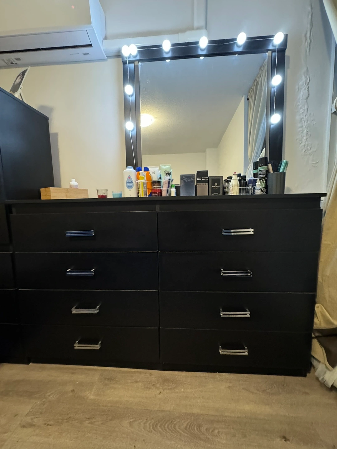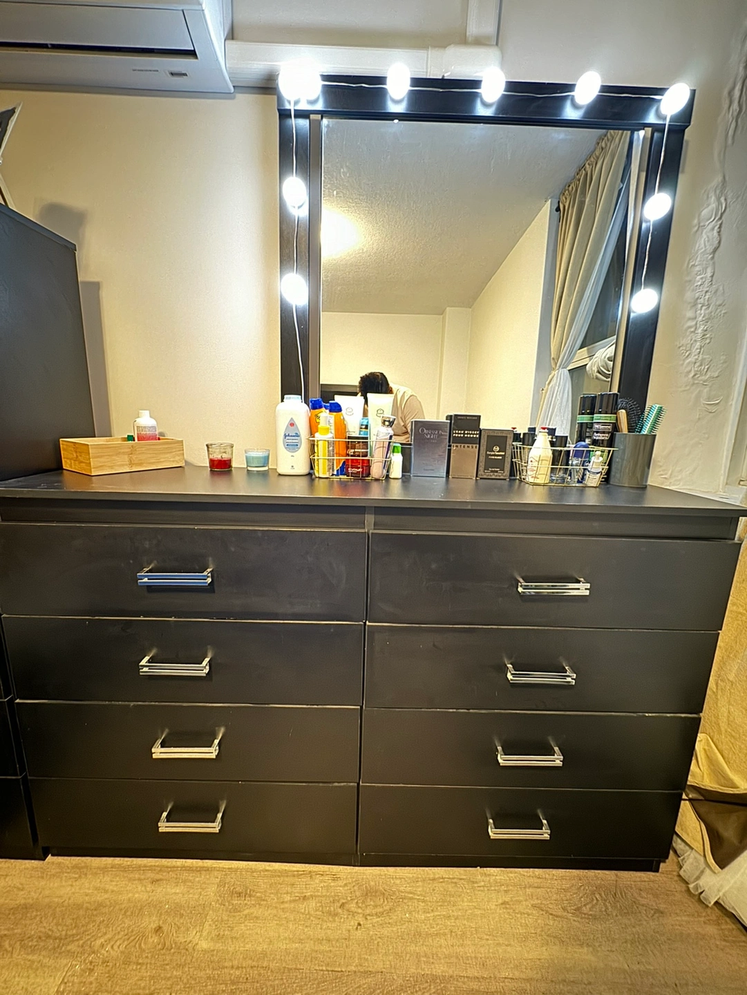 13Black vanity with six drawers and a mirror with lights. The mirror and lights are attached to the vanity.