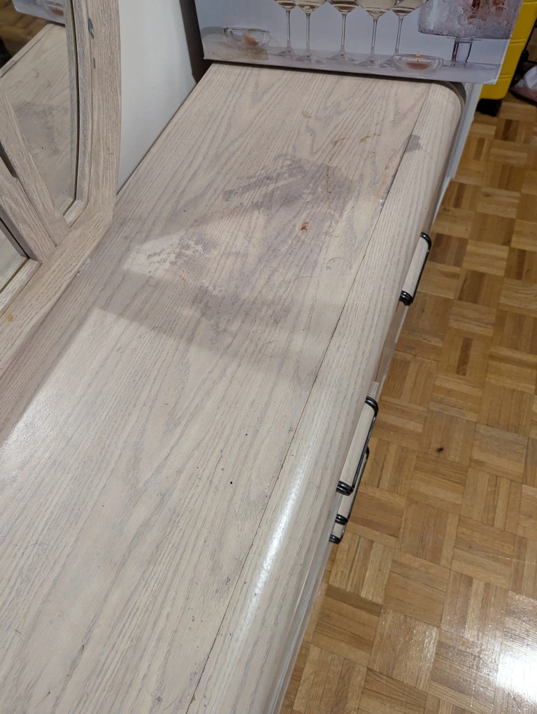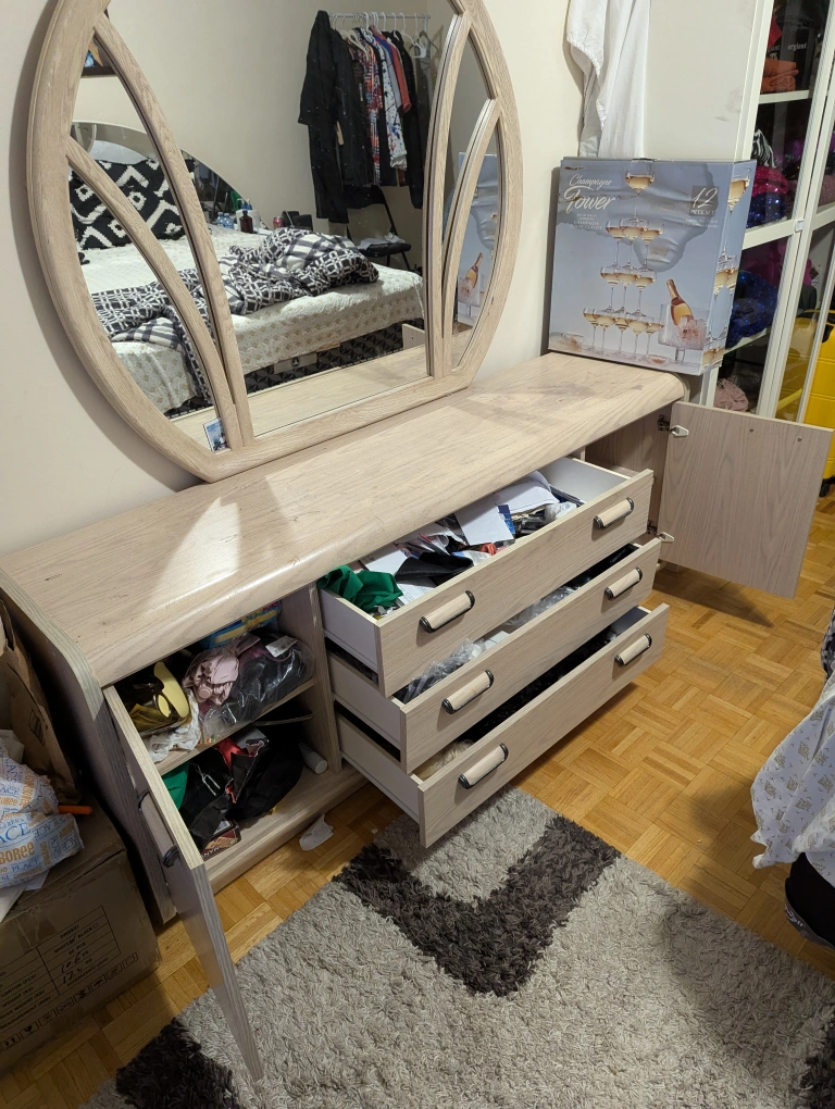 91This dresser with mirror offers ample storage and a touch of elegance with its unique oval mirror design, ideal for any bedroom. As a used item, it does have a few scratches and stains as shown in pictures. Additional details: * Five spacious drawers * Oval mirror with decorative frame * Durable construction FIRST COME, FIRST SERVED. If up, it's available.