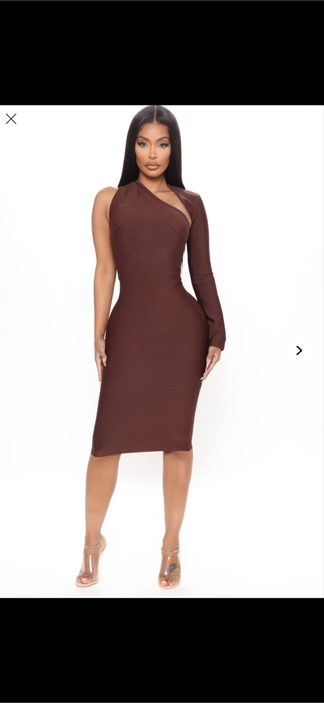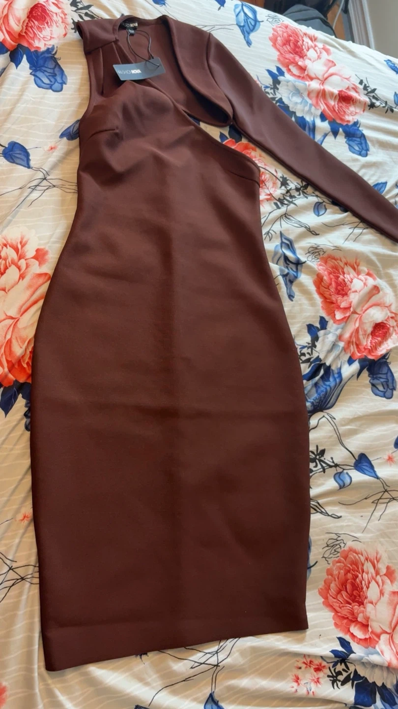 5Selling a Fashion Nova brown one-sleeve dress. It's in great condition and ready for a new home! The dress is a stylish and unique piece that will make you stand out. Perfect for parties or special occasions. Brand new with tag. Size L. ($45) The white dress is brand new too, never been worn, size L. ($16) Jordan 1 sneakers size 8 in great condition ($70) The sneakers are size 40 ($25 each)