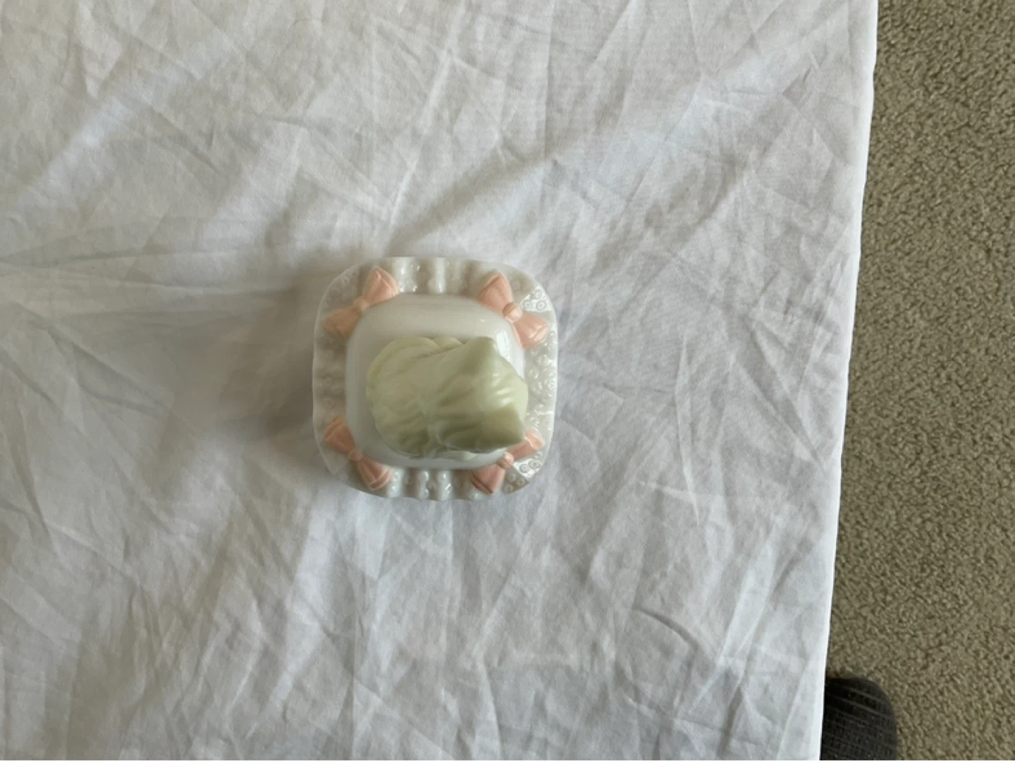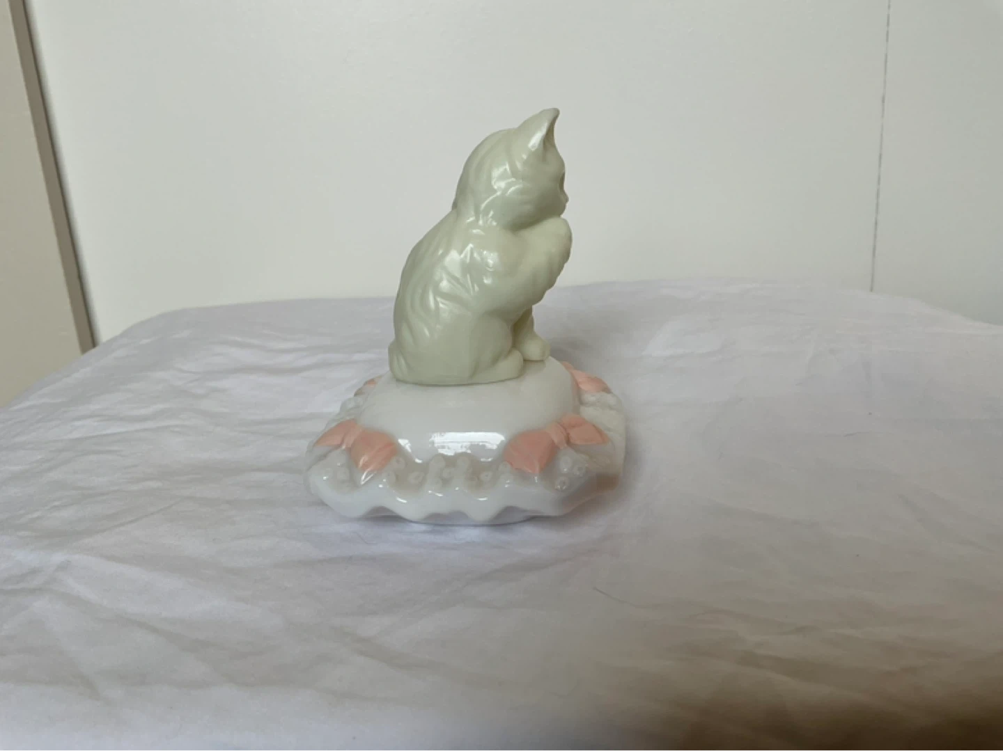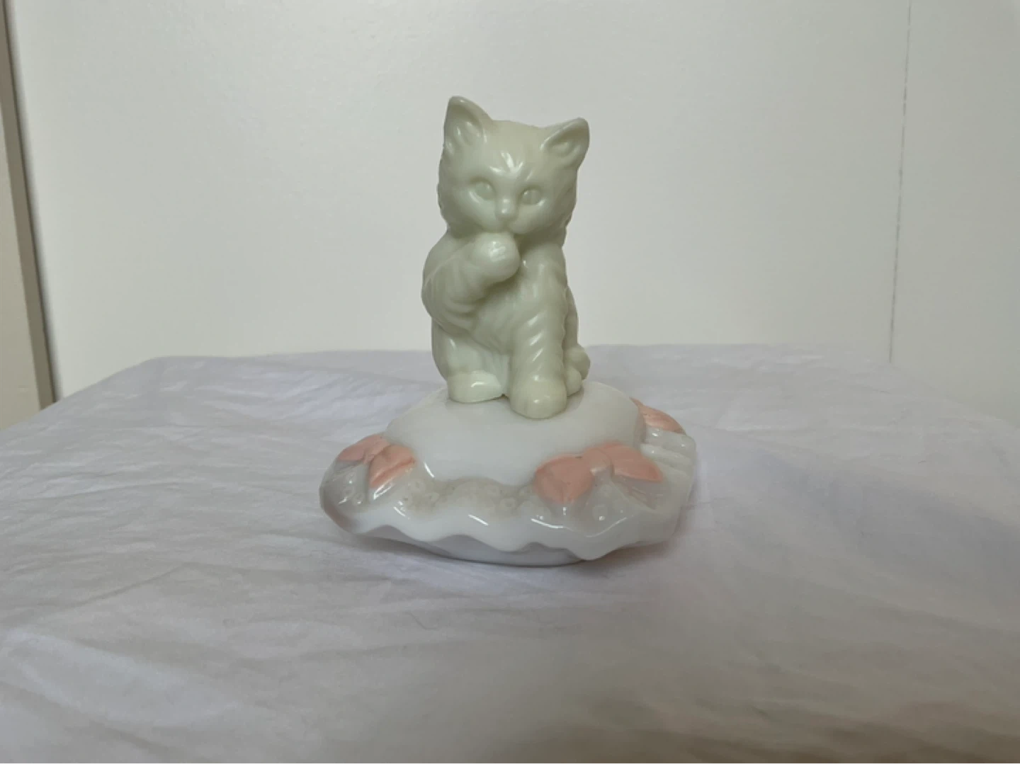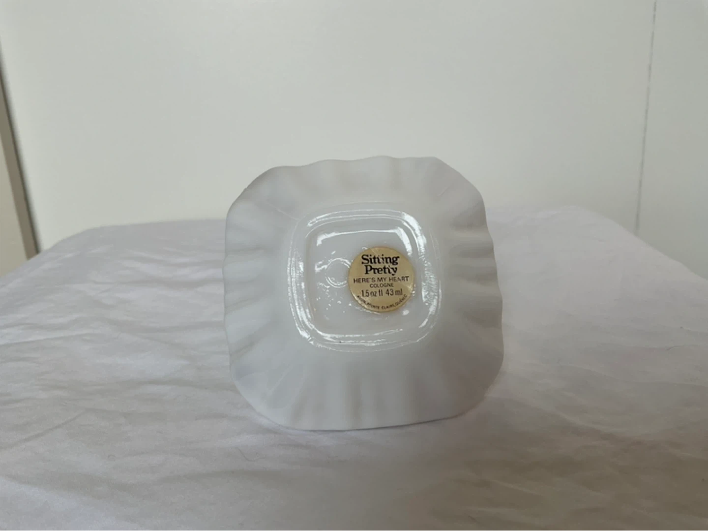 Milk glass pillow contains full bottle of Here’s my Heart cologne with label. Like new condition. Marine Drive and Kerr area. Cash only.