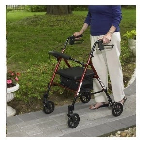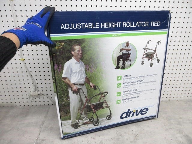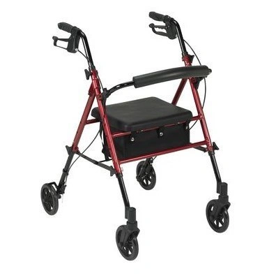 Red rollator walker. Adjustable height. Features a padded seat and storage bag. Four wheels. Excellent for mobility assistance.