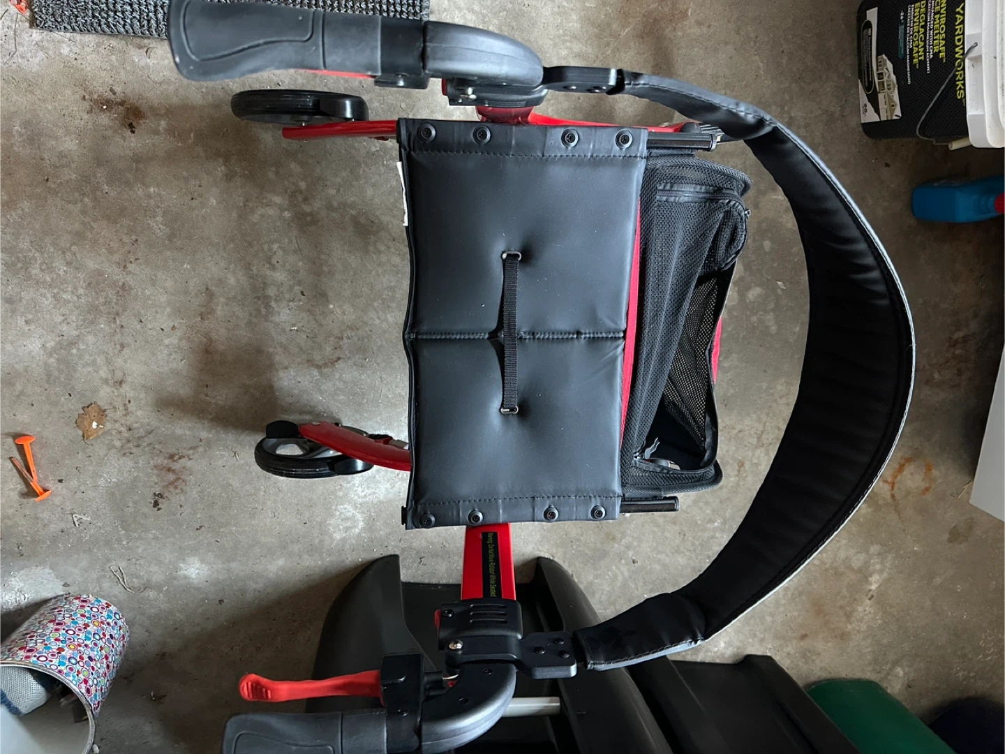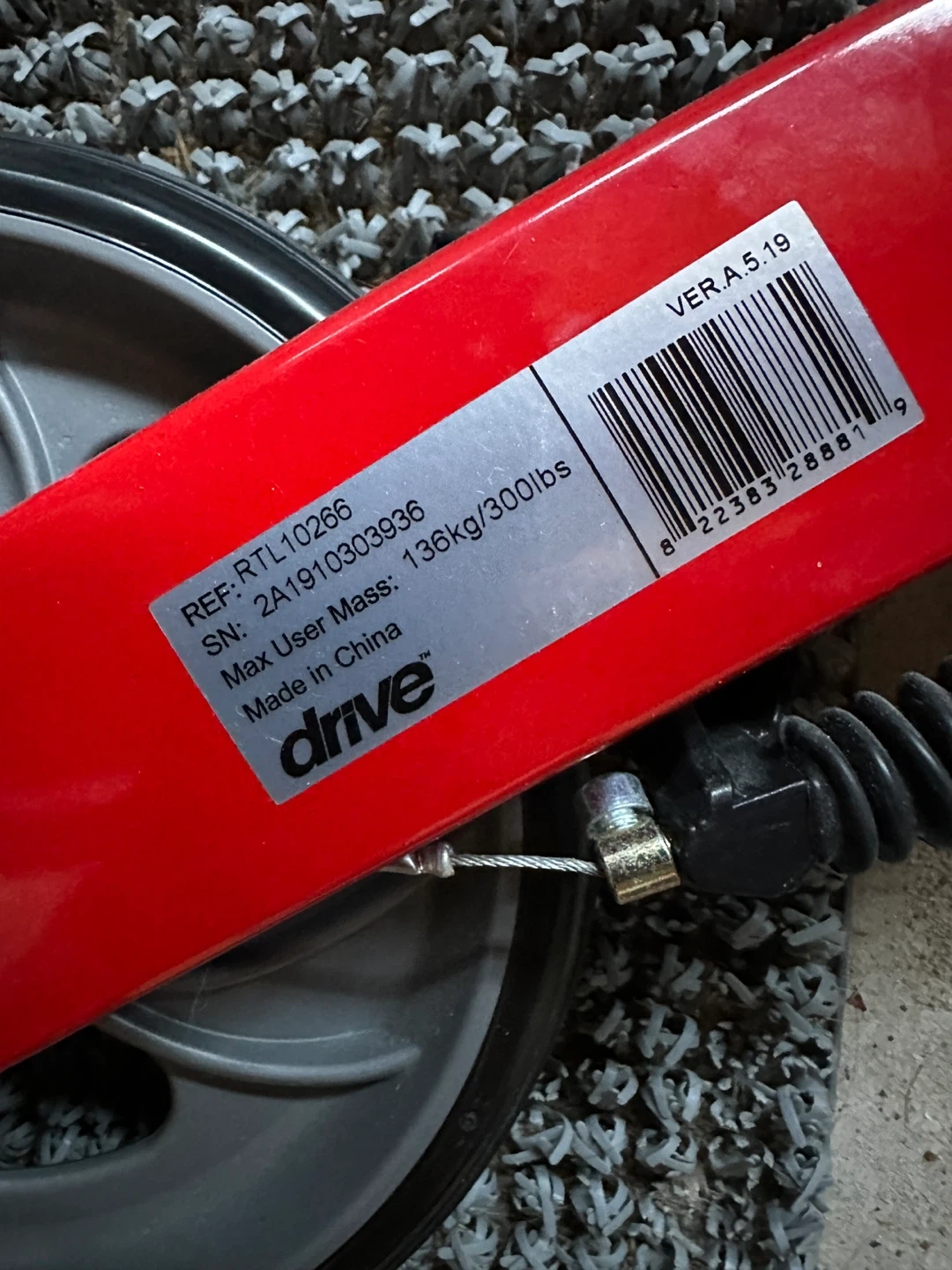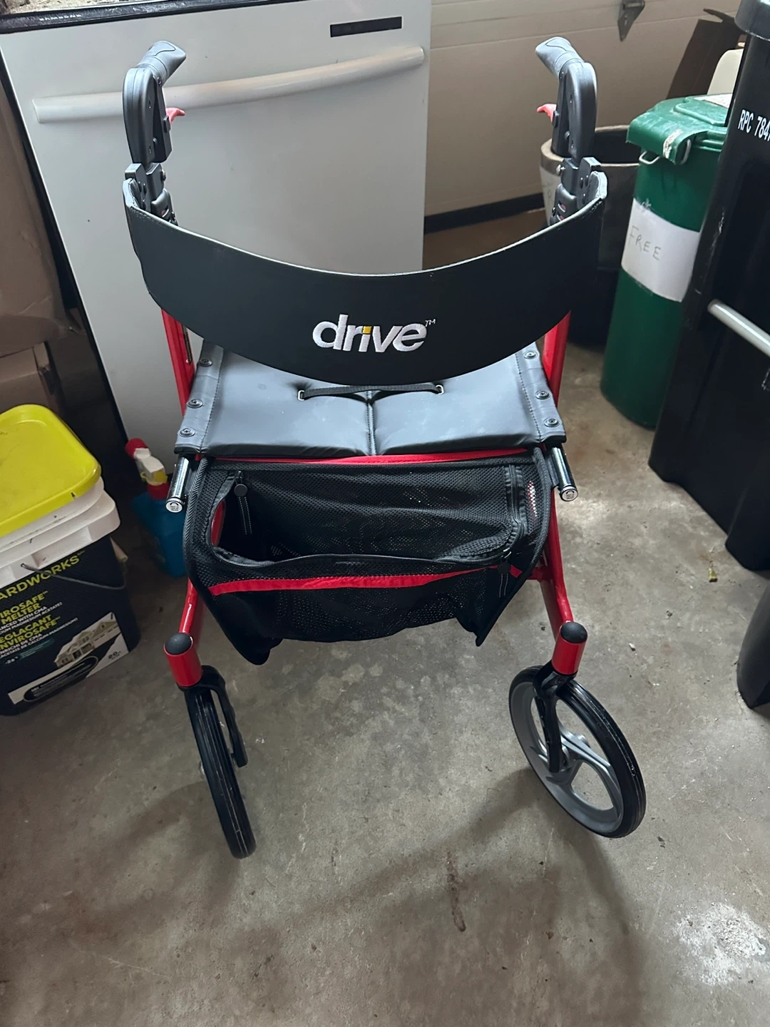 Selling a Drive Nitro Rollator Walker in red. It's in great condition and ready to help you get around. This rollator is designed for users up to 300 lbs. Features include a comfortable seat and a convenient storage bag. Slightly used.