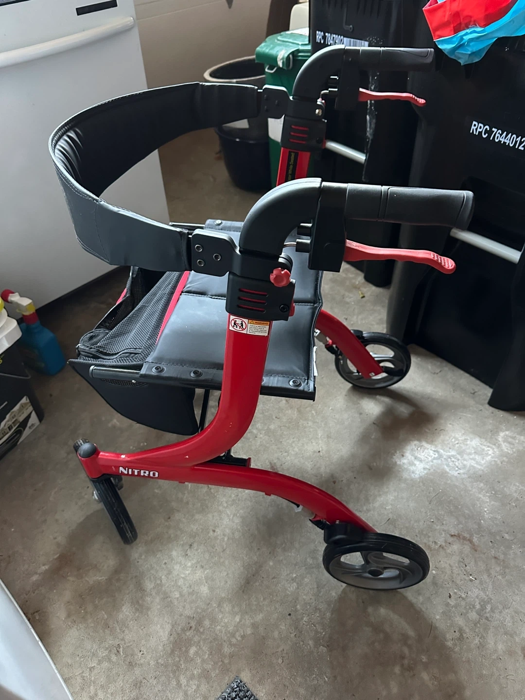 Selling a Drive Nitro Rollator Walker in red. It's in great condition and ready to help you get around. This rollator is designed for users up to 300 lbs. Features include a comfortable seat and a convenient storage bag. Slightly used.