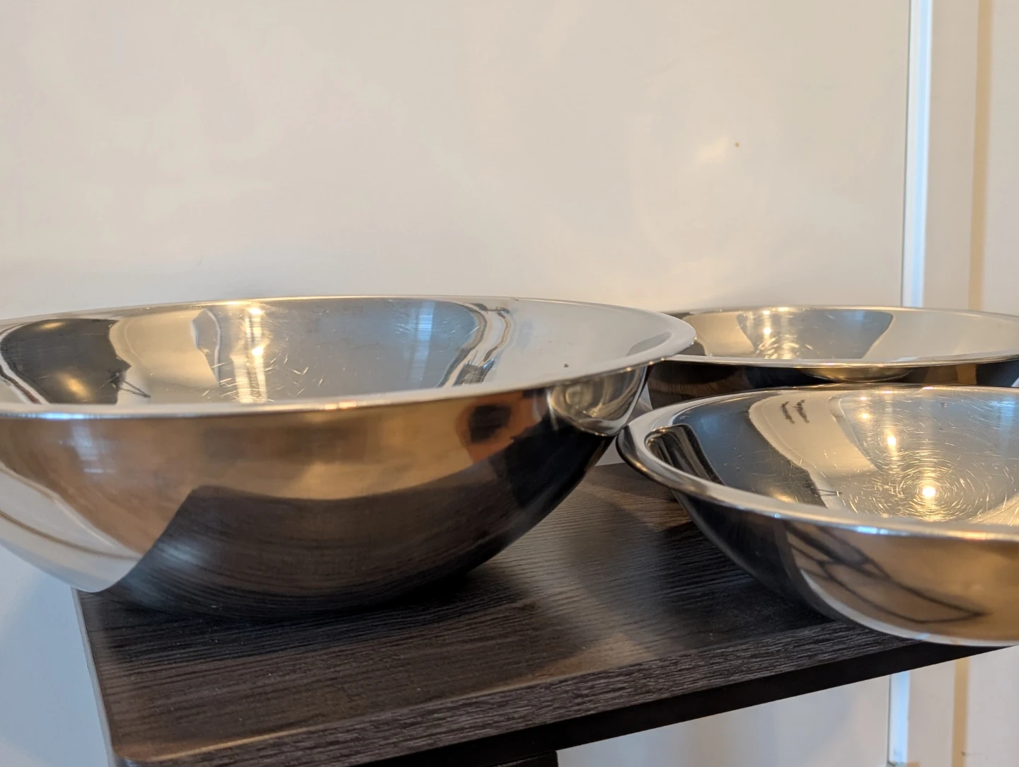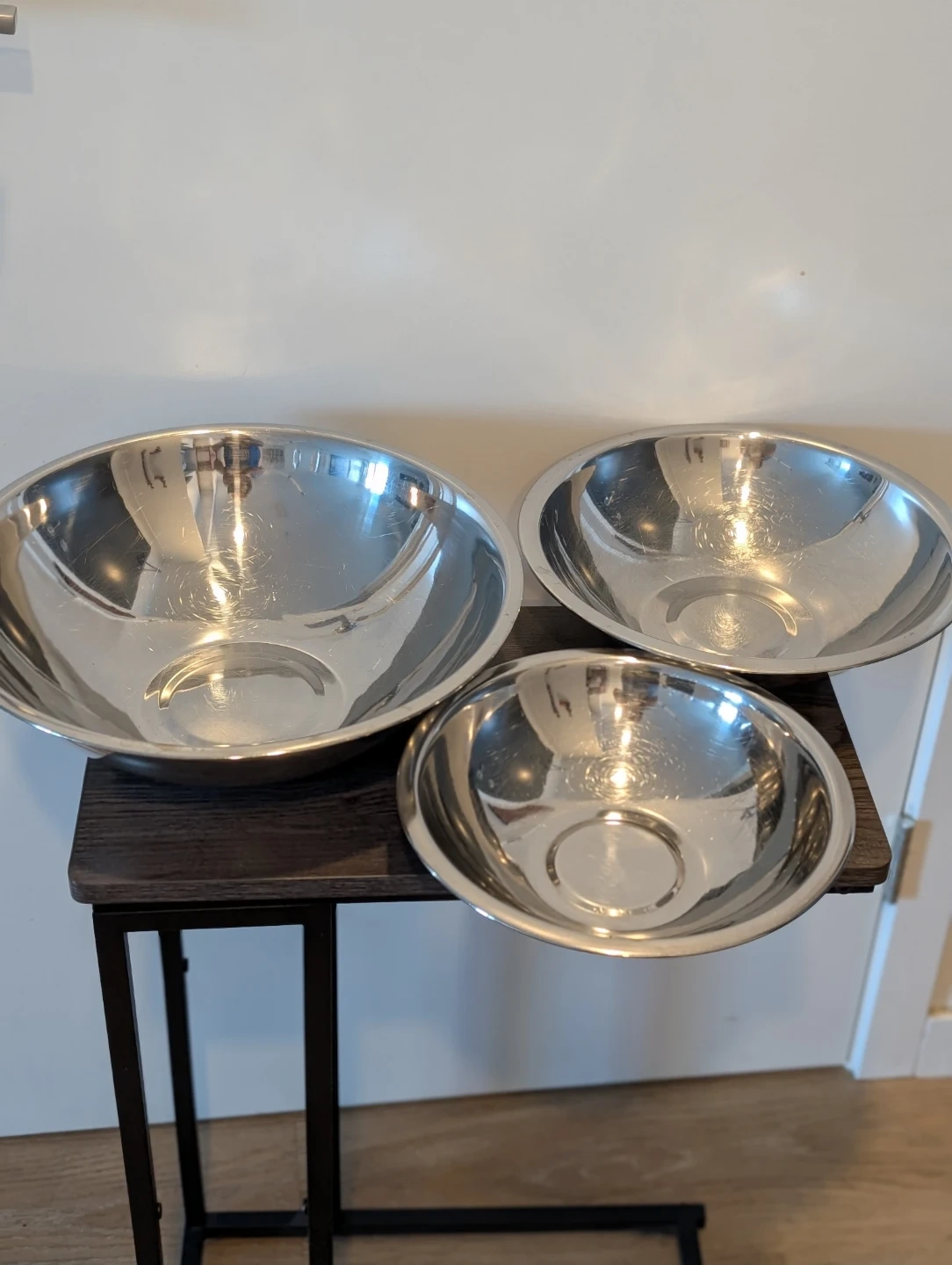 Set of three stainless steel mixing bowls. They're durable and easy to clean. Dishwasher safe. Great condition.