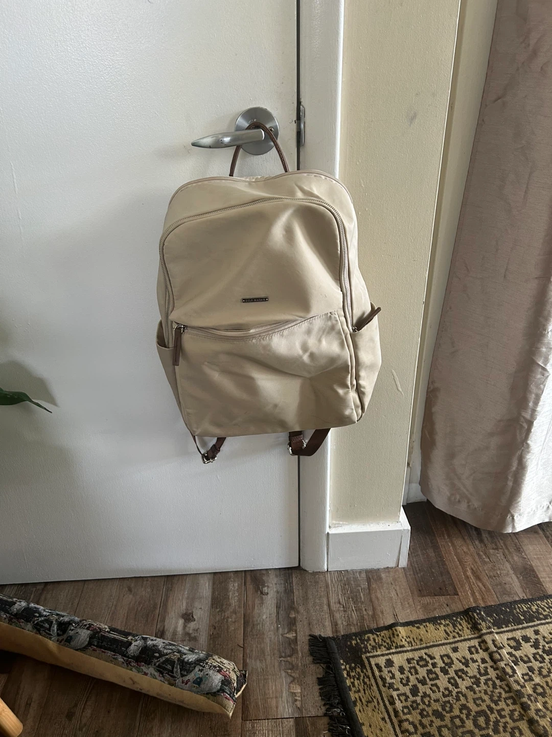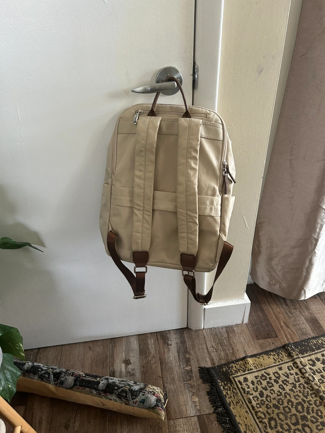 Stylish beige backpack by Golf Madam. It's made of durable nylon with brown faux leather accents. Multiple pockets for organization. Great for everyday use or travel!