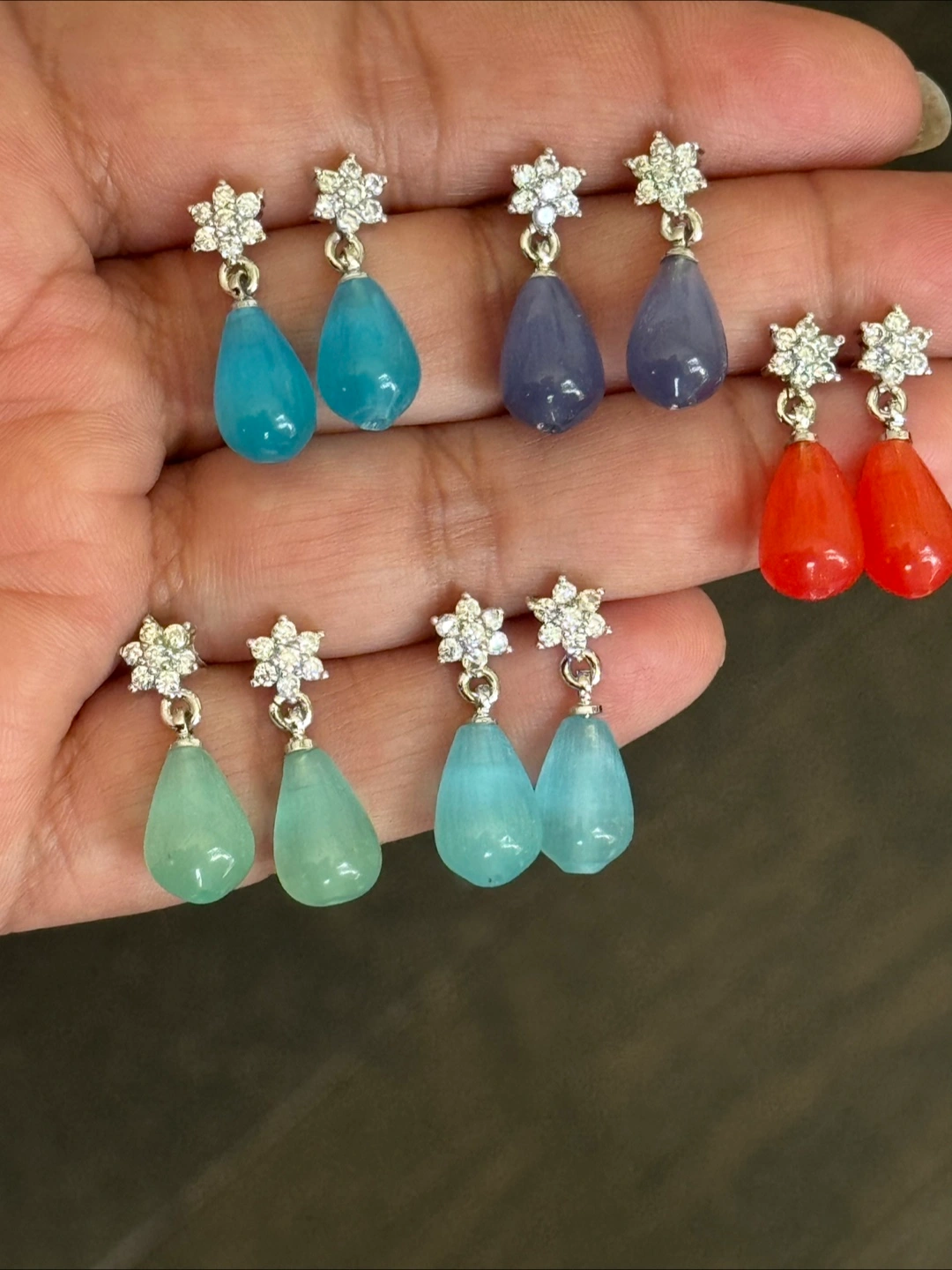 Selling these adorable drop earrings! They feature a cute flower design at the top and a teardrop-shaped gemstone in a variety of colours. Perfect for adding a pop of colour to any outfit!