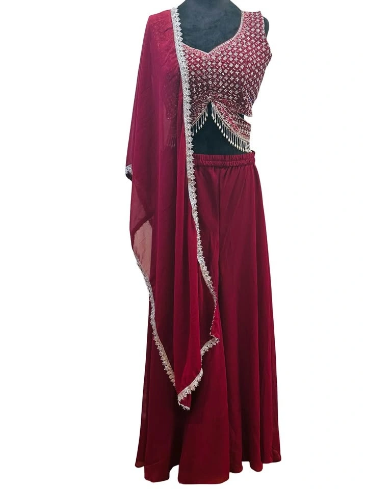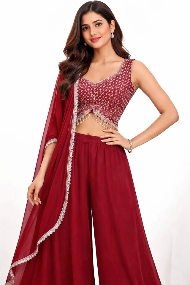 Elegant maroon ethnic outfit. Features a sleeveless crop top with intricate embroidery and dangling beads. Comes with matching wide-leg pants and a dupatta, both with silver trim.