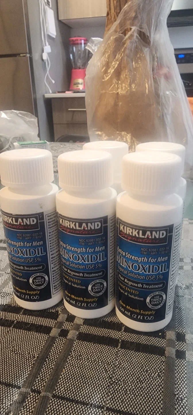 Four bottles of Kirkland Signature Minoxidil Extra Strength for Men Topical Solution 5%. Each bottle is a one-month supply, 60 ml (2 fl oz).