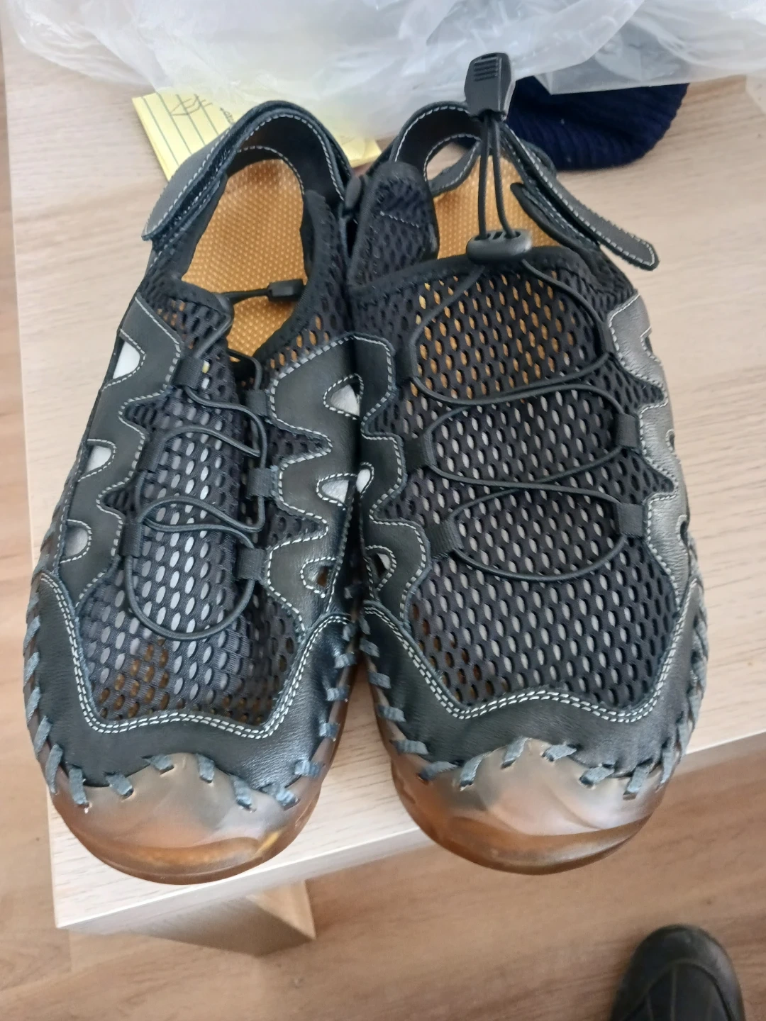 Selling a pair of black leather fisherman sandals. They feature a unique sole design and breathable mesh upper. Great for casual wear!