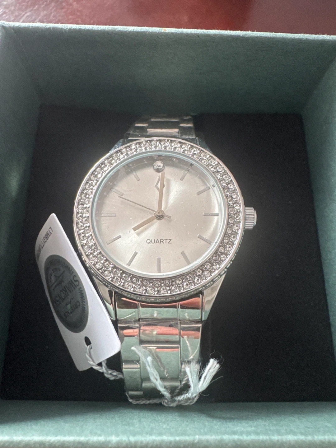 Elegant silver-tone watch by NIC & SYD, featuring a full bezel of Swarovski crystals. It's a quartz movement watch with a metal link band. Includes original box and tag.