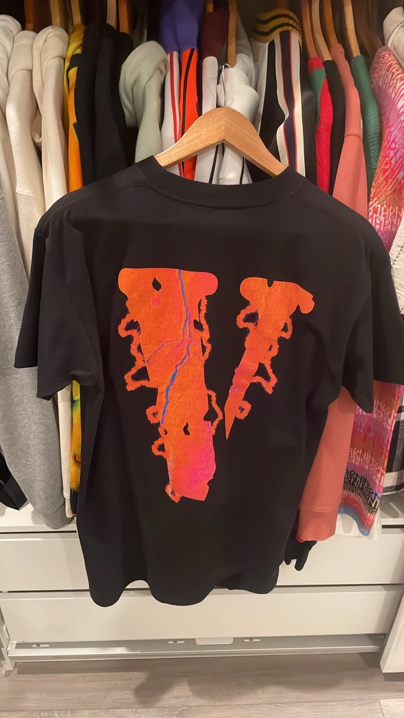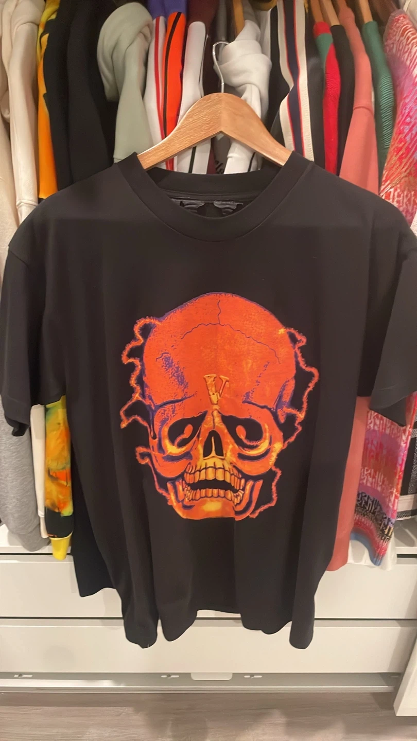 This is a VLONE black t-shirt featuring a large skull graphic on the front and a 'V' logo on the back. It's made from a soft cotton blend. Perfect for casual wear!