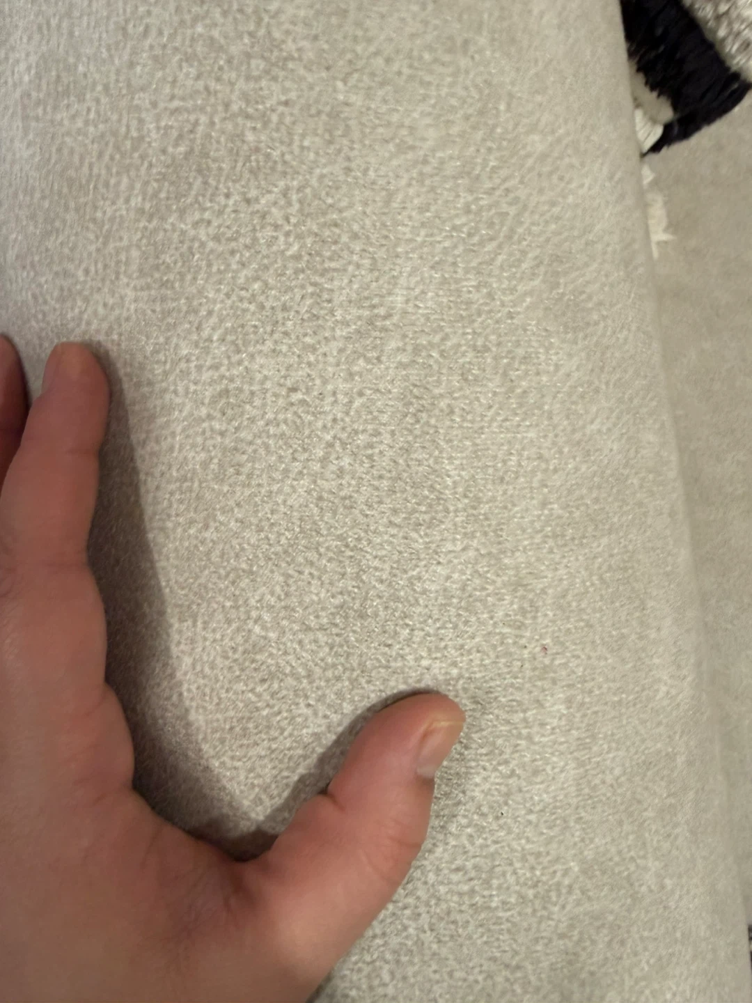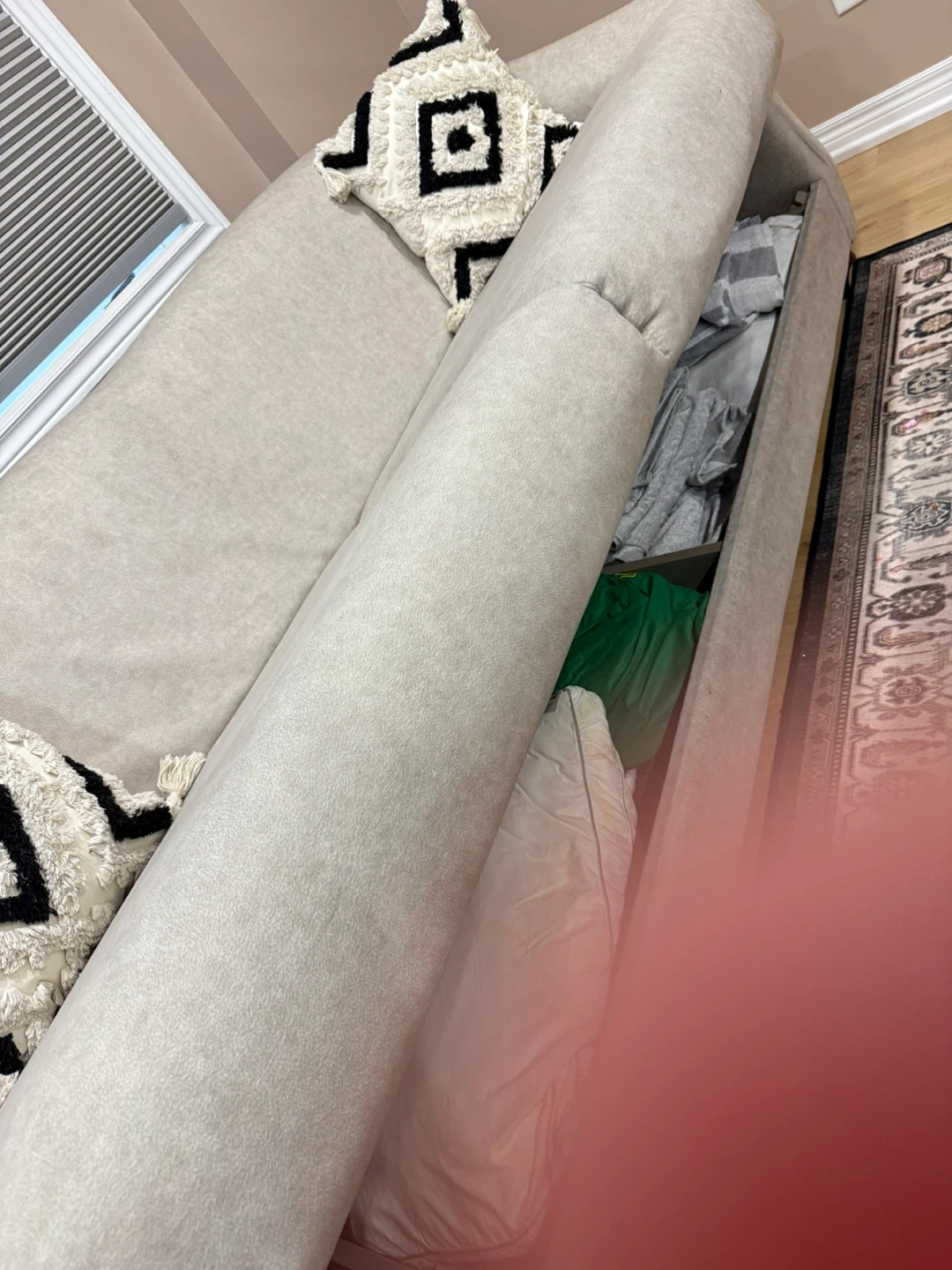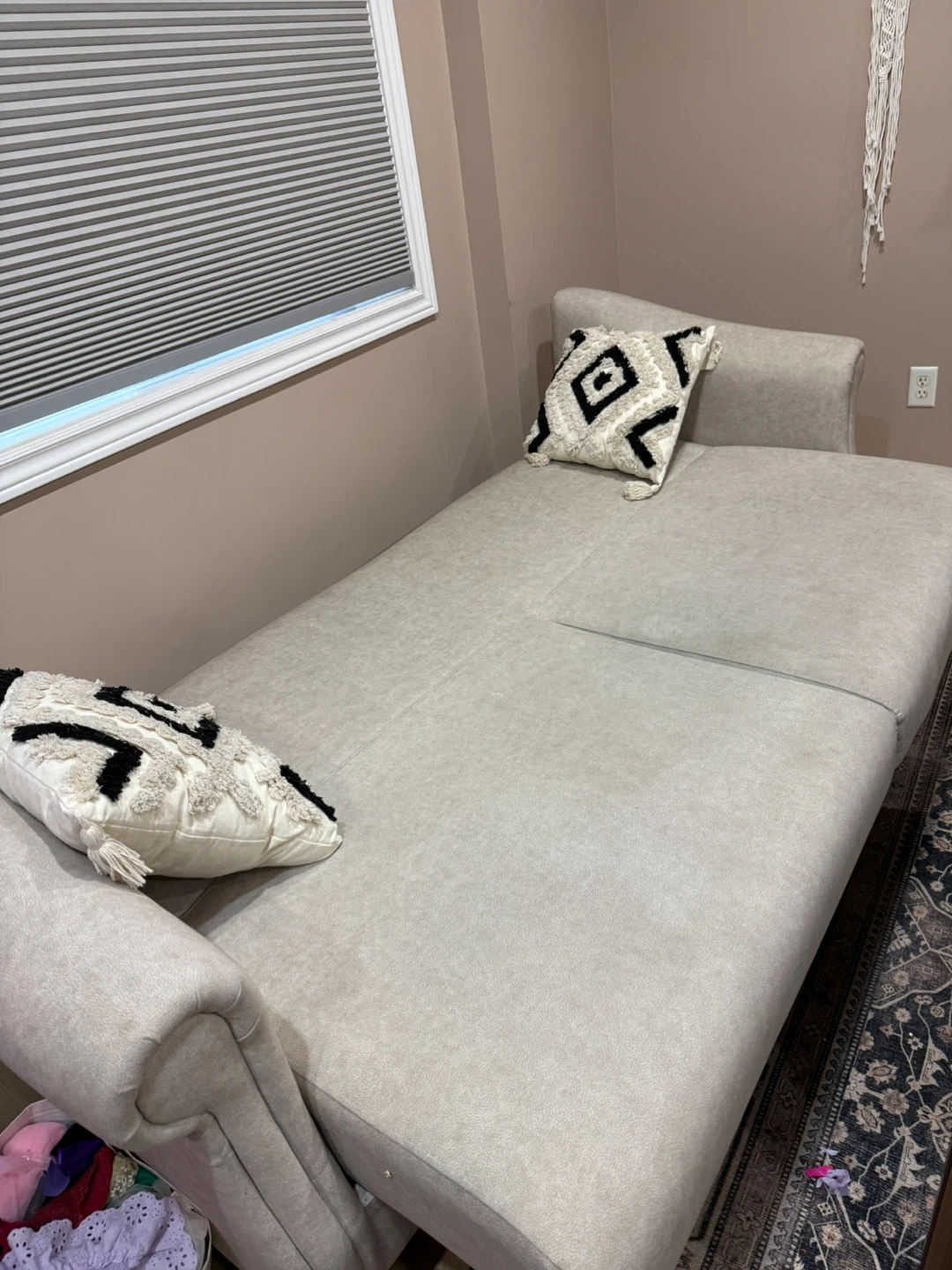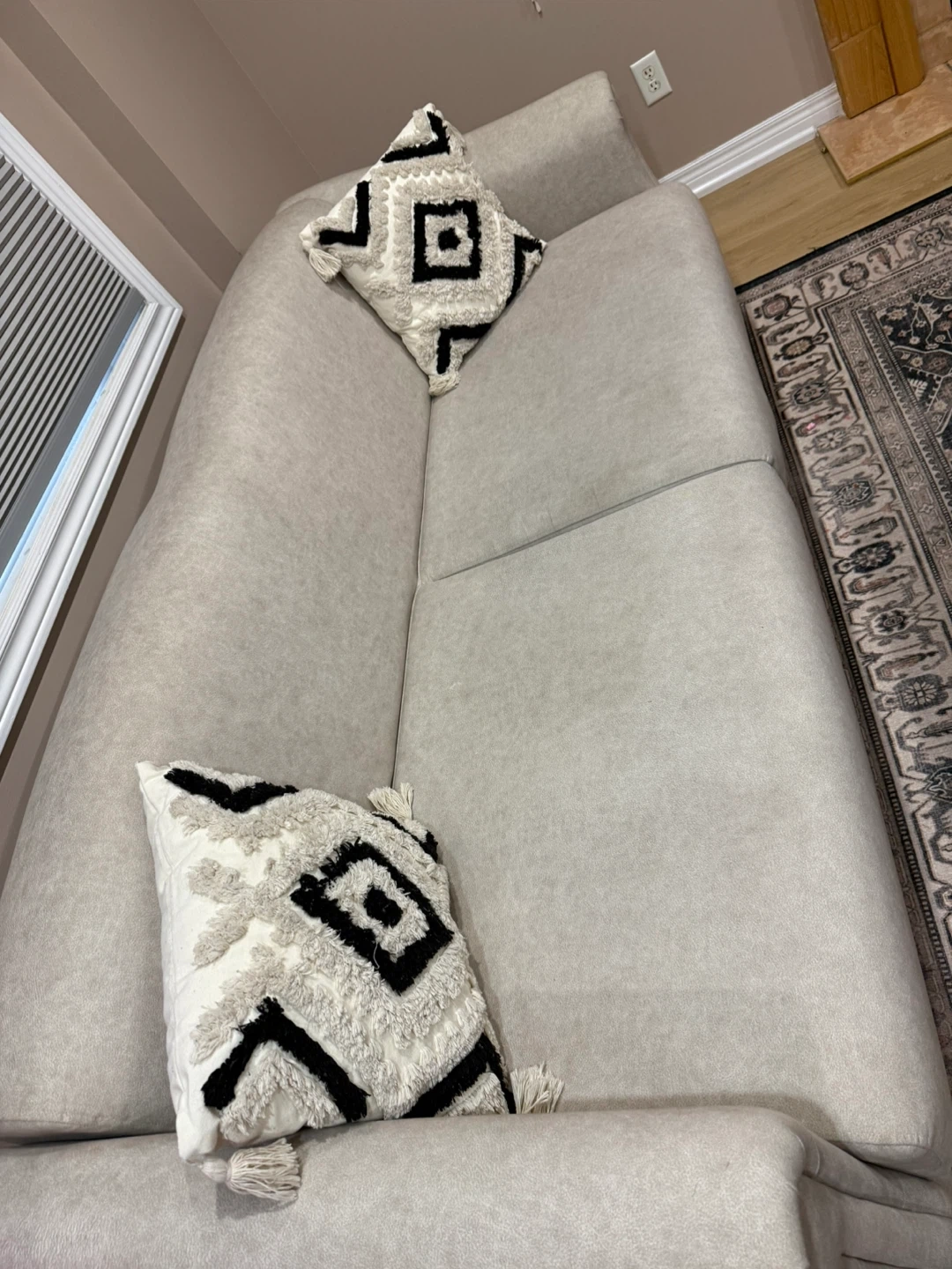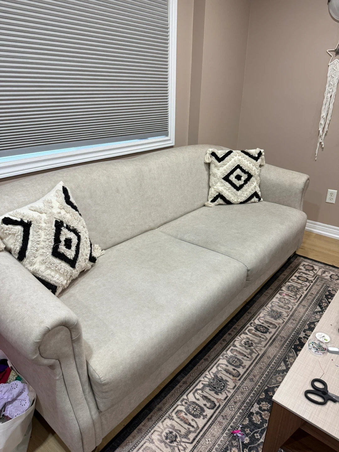 A comfortable beige sofa with a textured fabric. It comes with two decorative throw pillows featuring a black and white geometric pattern. Perfect for a living room or den!