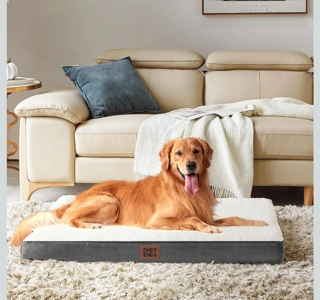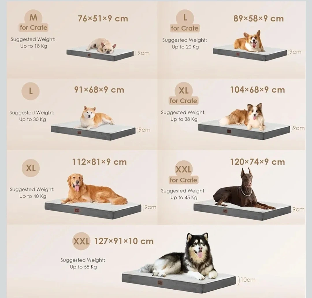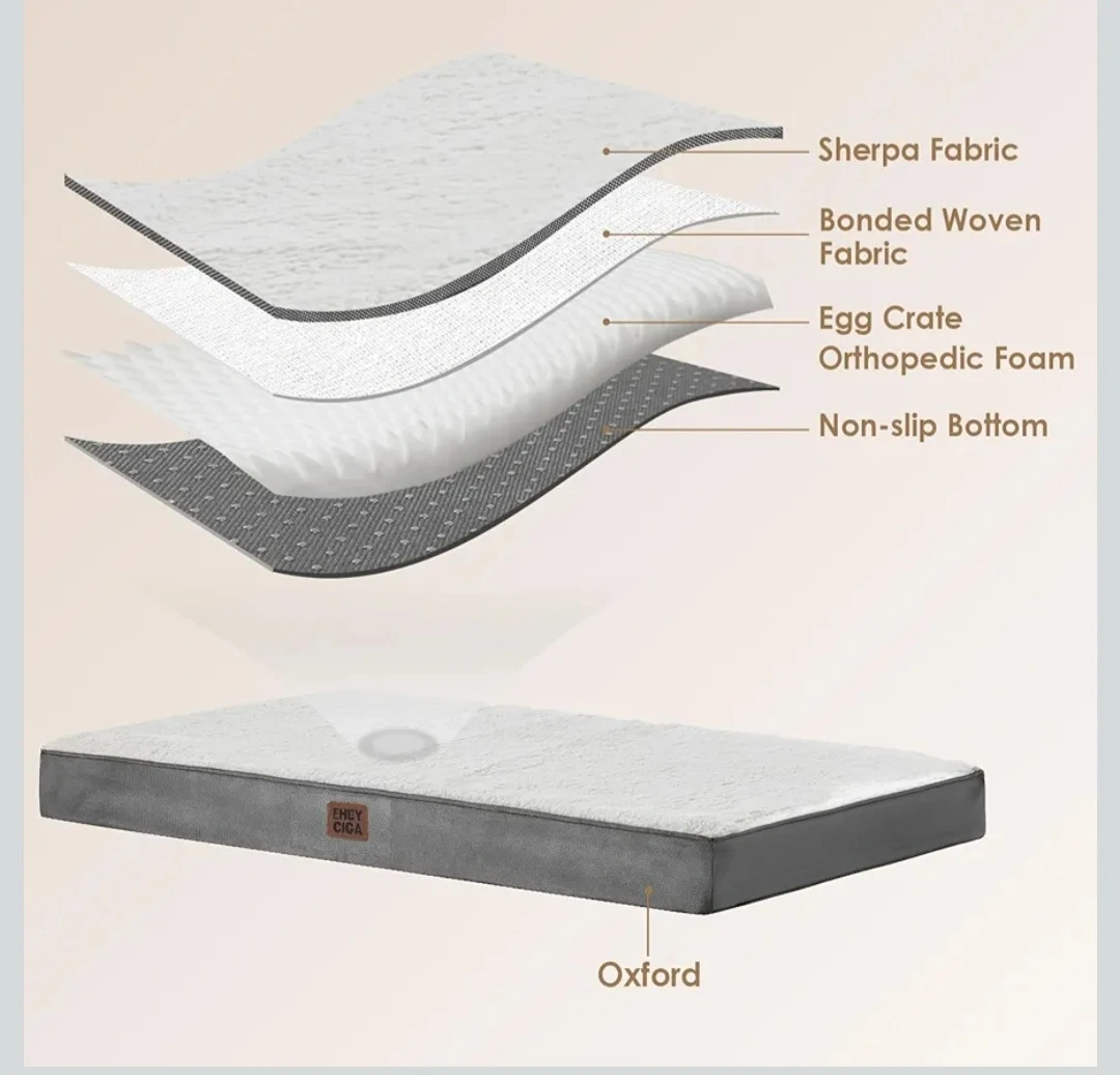 This dog bed features a comfortable orthopedic foam base that supports joints. It's designed with egg crate foam to cushion pressure points. The cover is made from plush material for extra comfort. Provides a cozy spot for your furry friend!