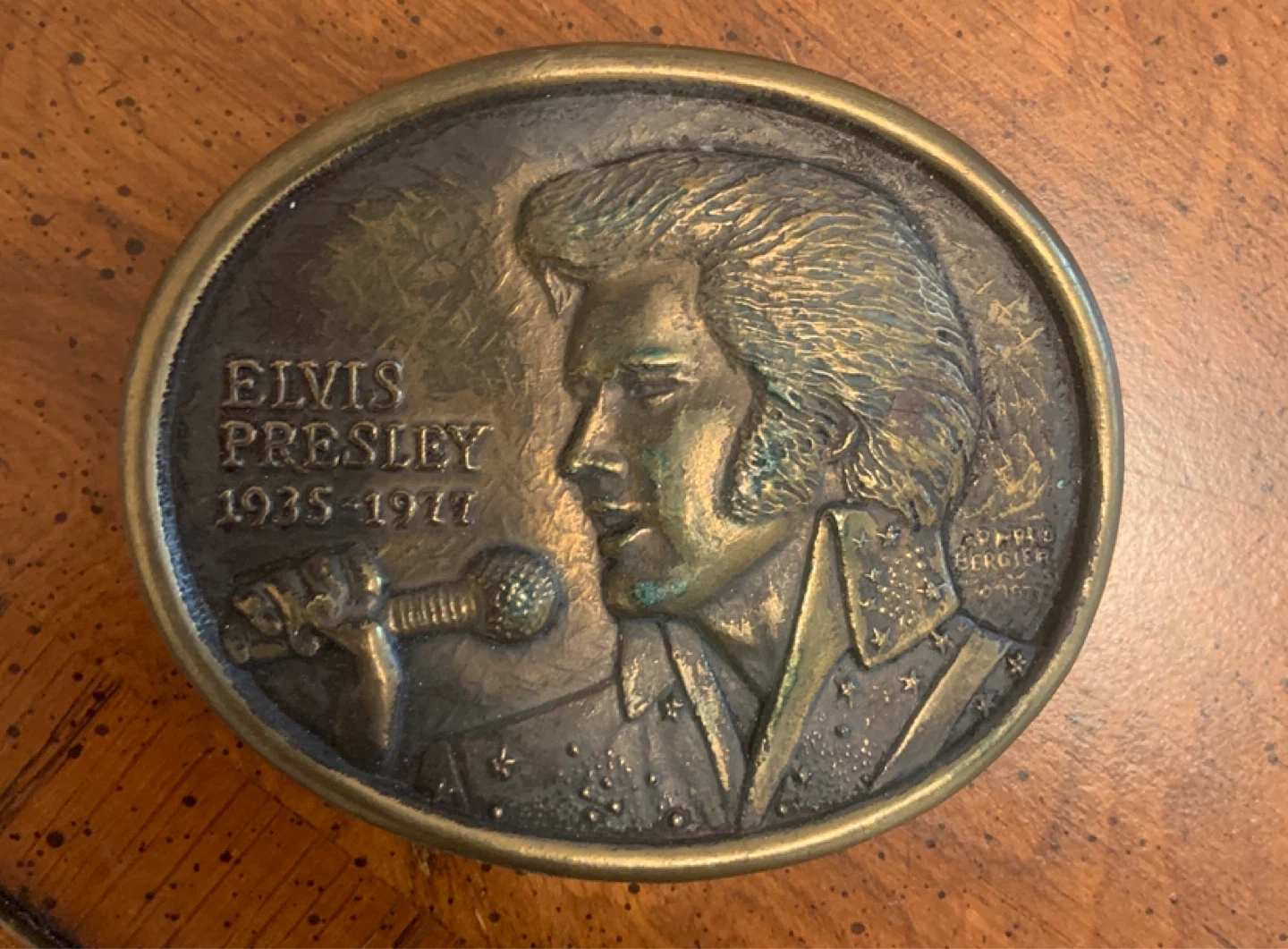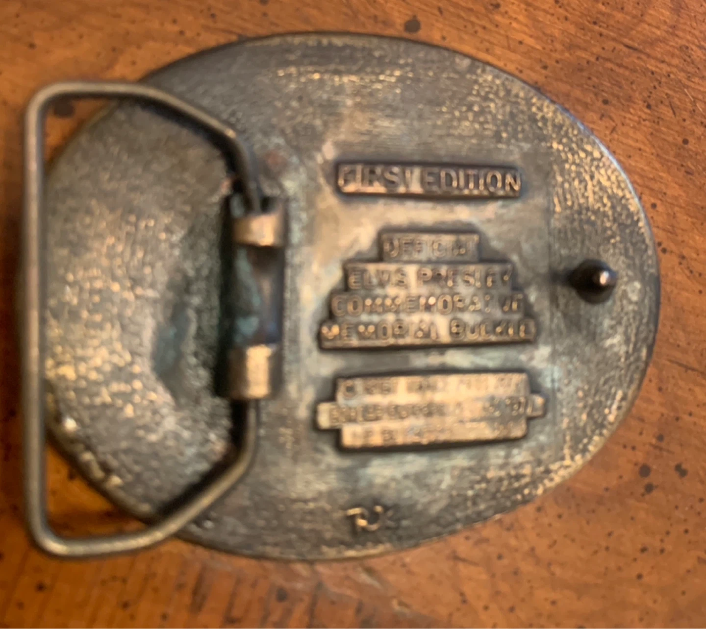This is a 'First Edition' belt buckle featuring Elvis Presley. It's made of metal and commemorates his life from 1935 to 1977. A great piece for any Elvis fan!