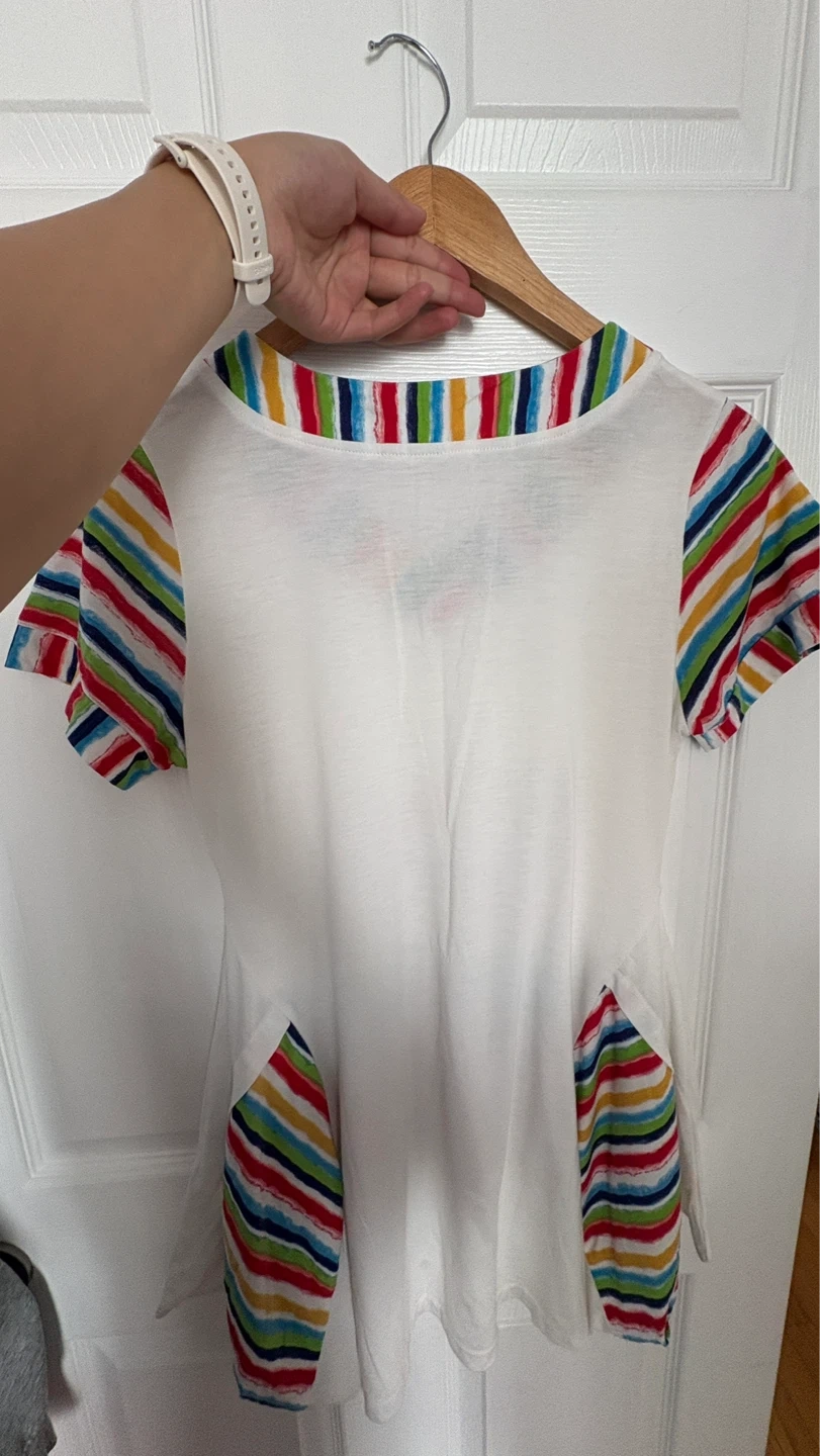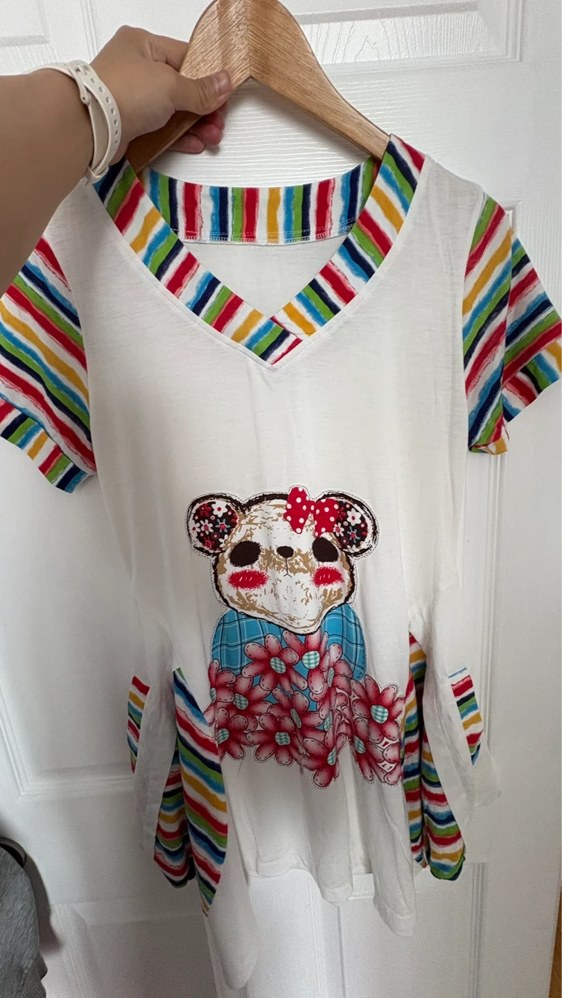 Short-sleeve v-neck sleepwear in white with a colourful bear graphic on the front. Features rainbow striped trim on the neckline and sleeves, and matching striped pocket details. Cotton blend material.