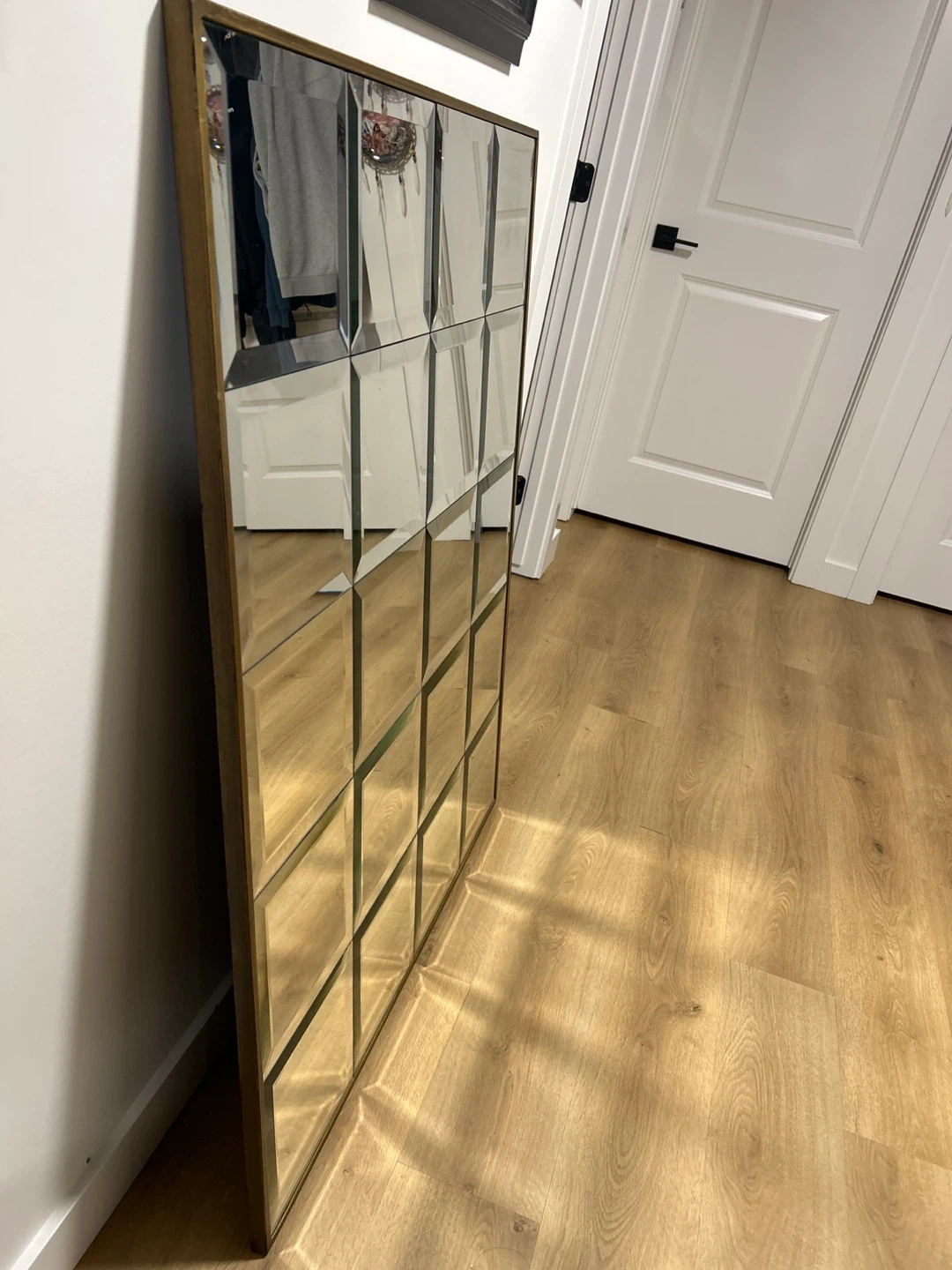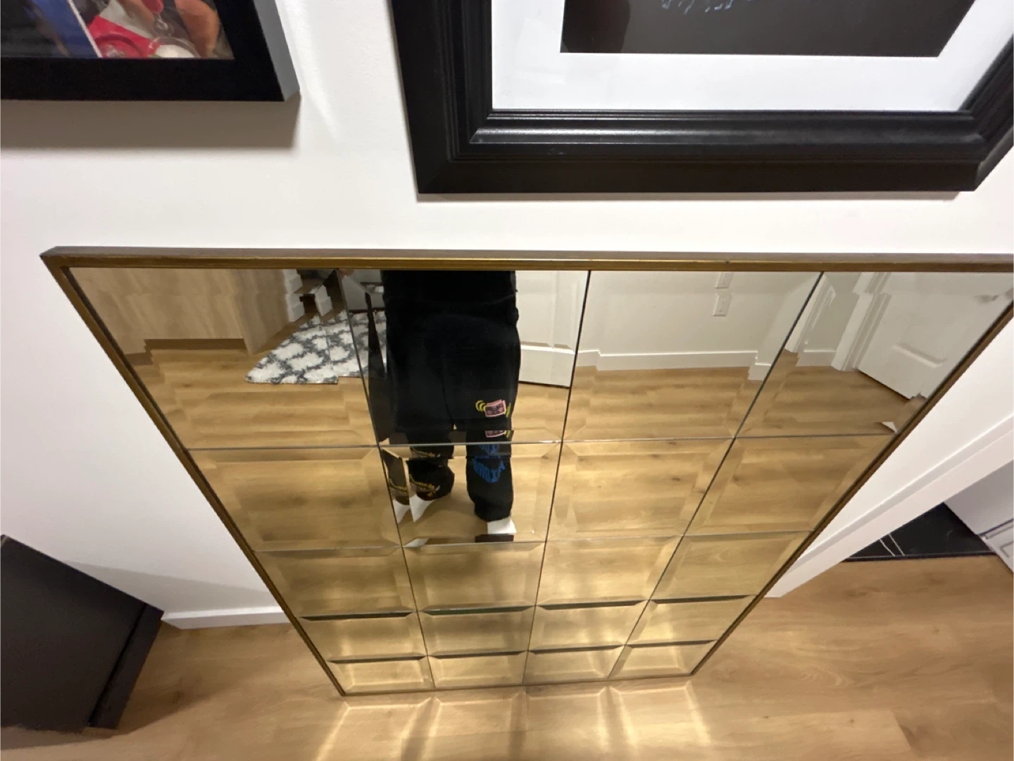 A decorative wall mirror with a gold-toned frame. It features a segmented mirrored surface, creating a unique visual effect.