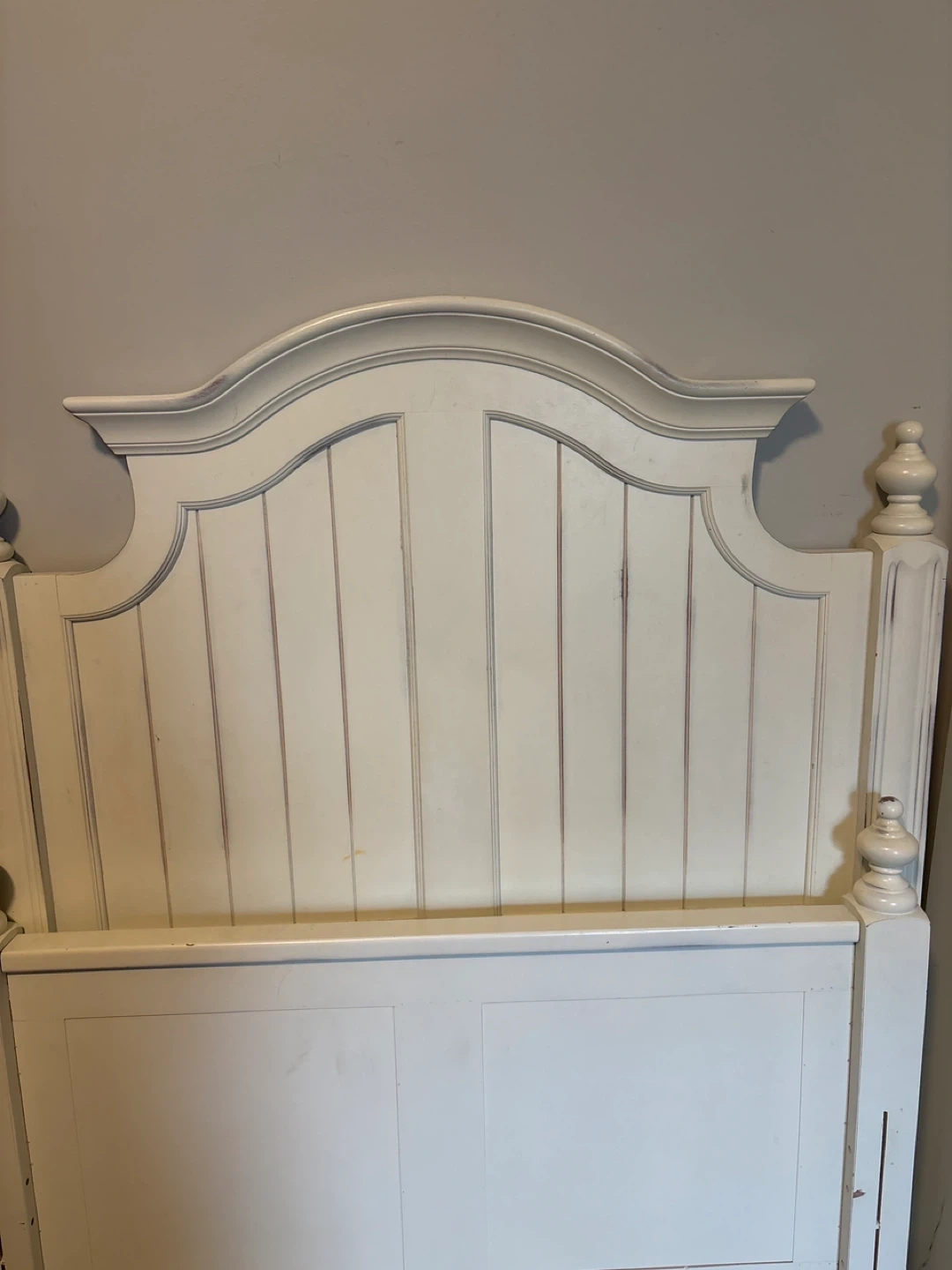 Has a pretty "camelback" headboard and classic distressed white beaded wainscot paneling.