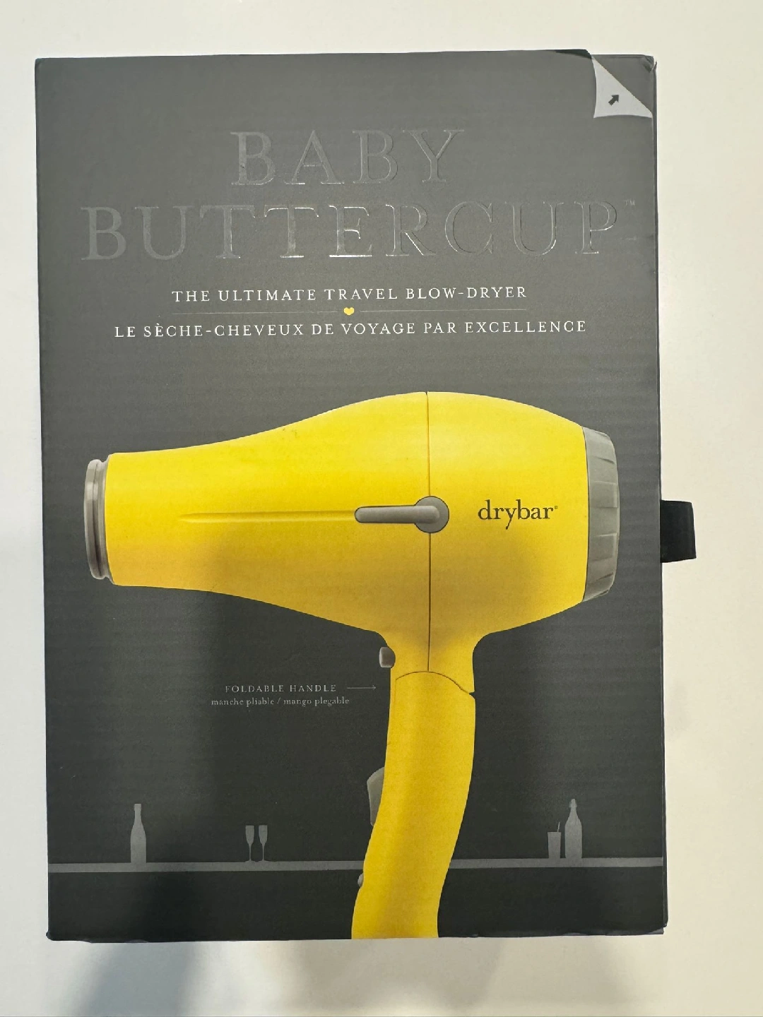 Selling a Drybar Baby Buttercup, the ultimate travel blow-dryer! It features a foldable handle, making it super convenient for packing. The box is included