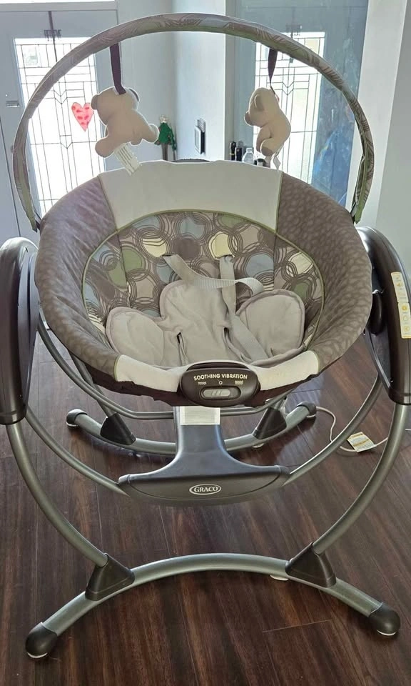 Graco baby electric rocker/glider. Adjustable angle for downtime or rest. Multi-speed rocking. Plays music or relaxing sounds. Power cord provided so no need for batteries. Was a true life saver.
